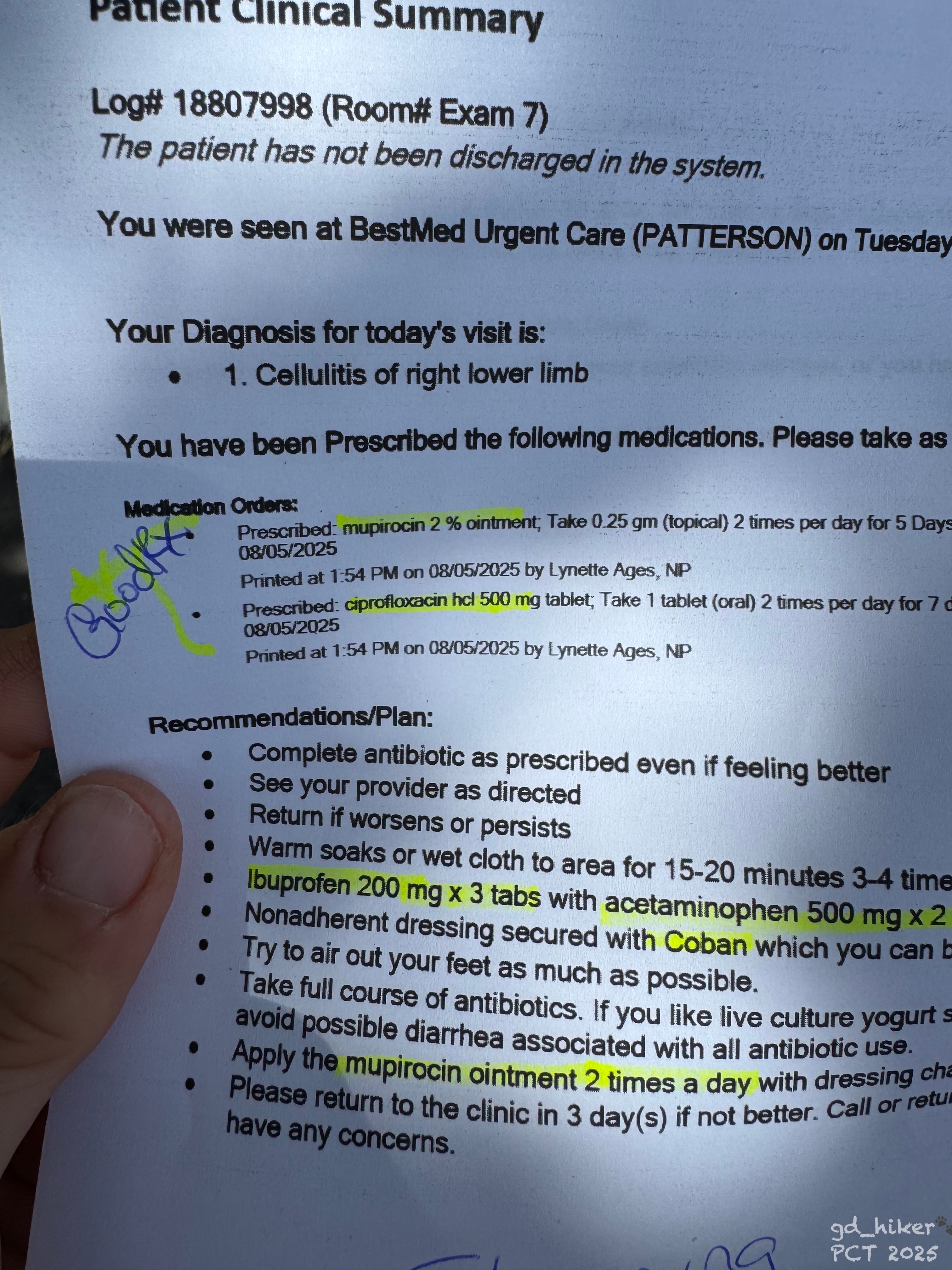 I didn’t understand all the medical English, but “antibiotics” was clear – both oral (one week) and a cream for the rest of my hike, which she didn’t try to talk me out of. She gave me a few tips and instructions for the trail and handed me some paperwork to take to the pharmacy.