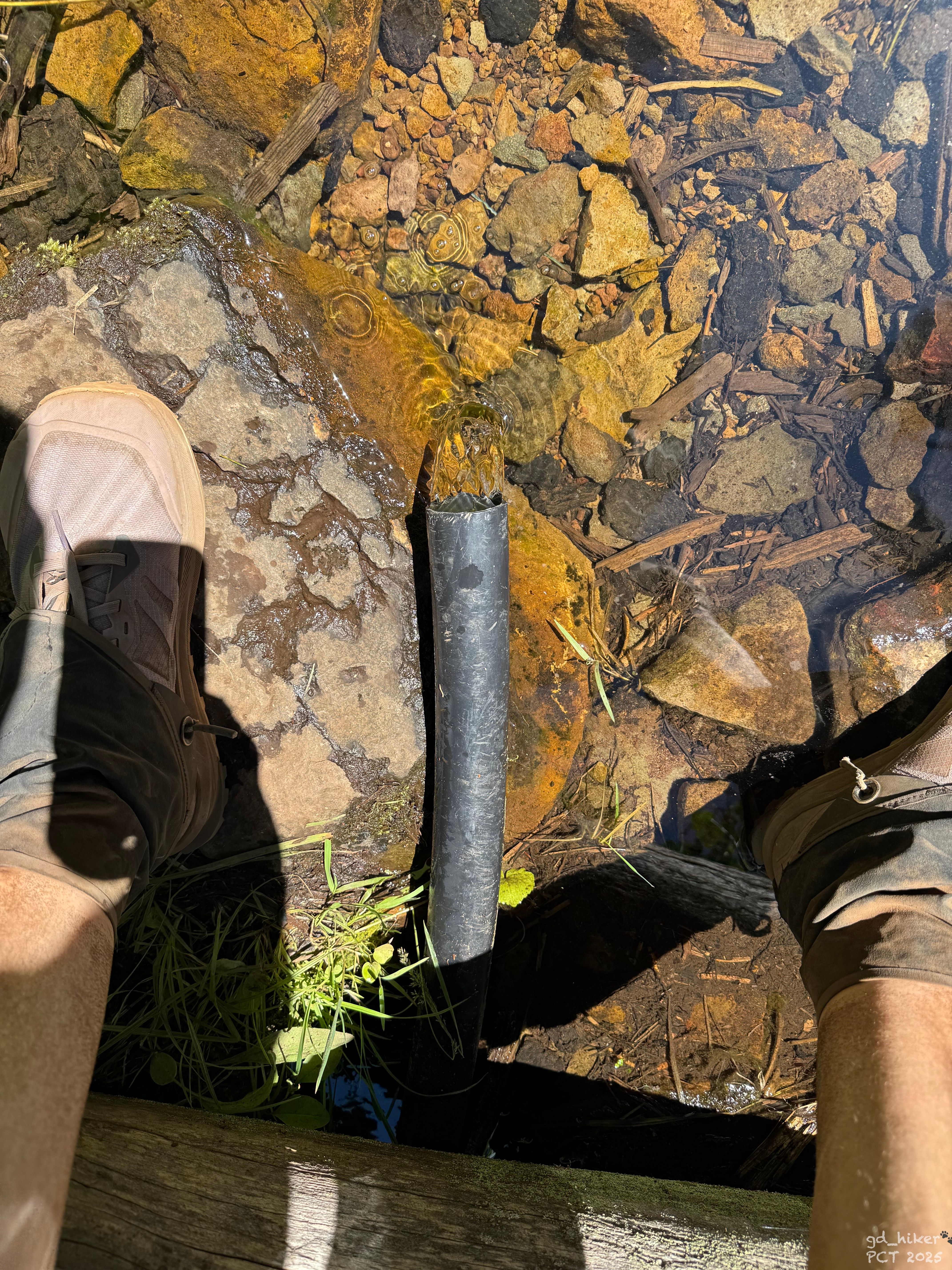 After about 13 km, I met another group of hikers. Almost all of them were NOBOs resting in the shade. The main reason, however, was a nearby pipeline used as a water source.