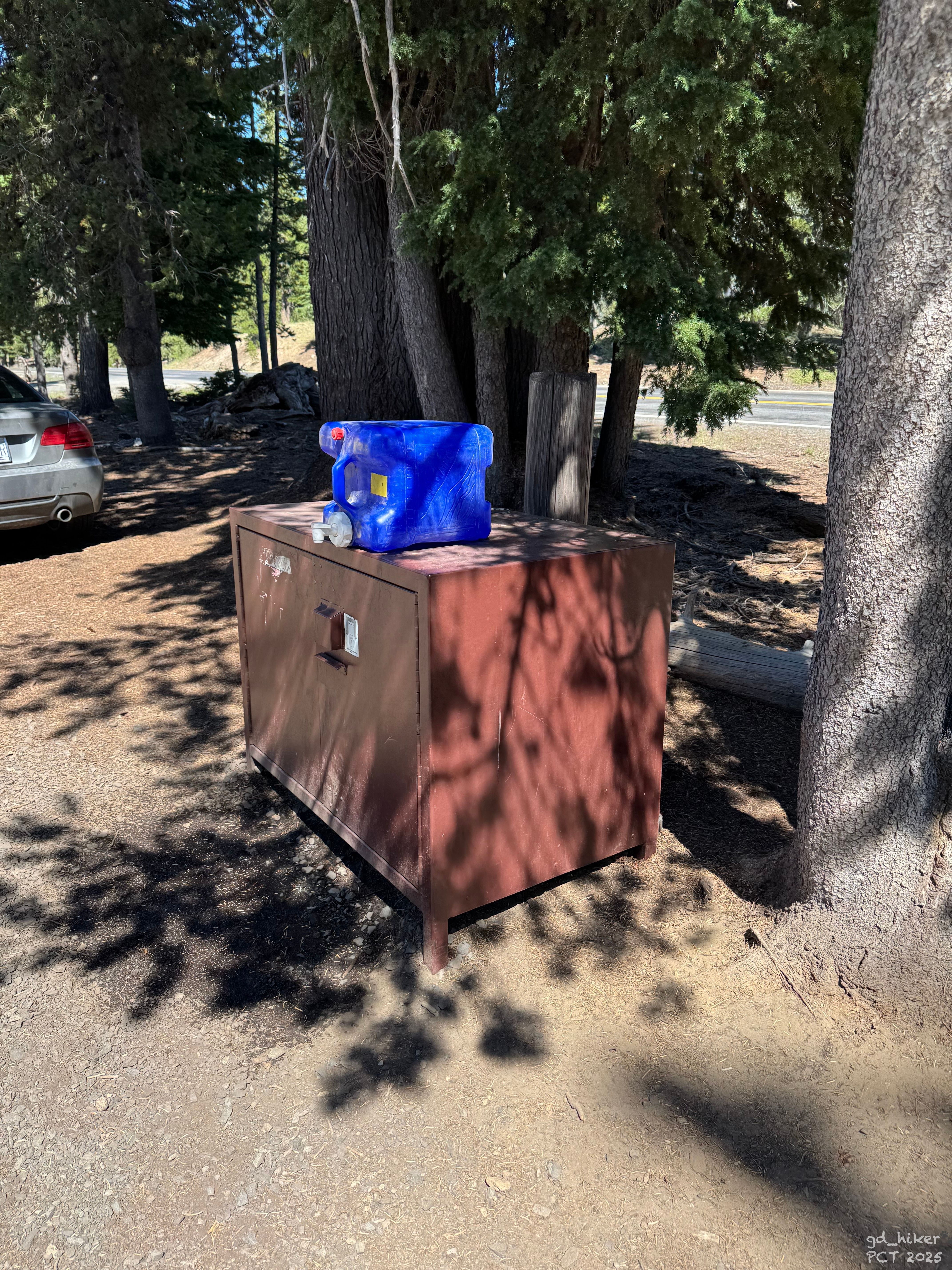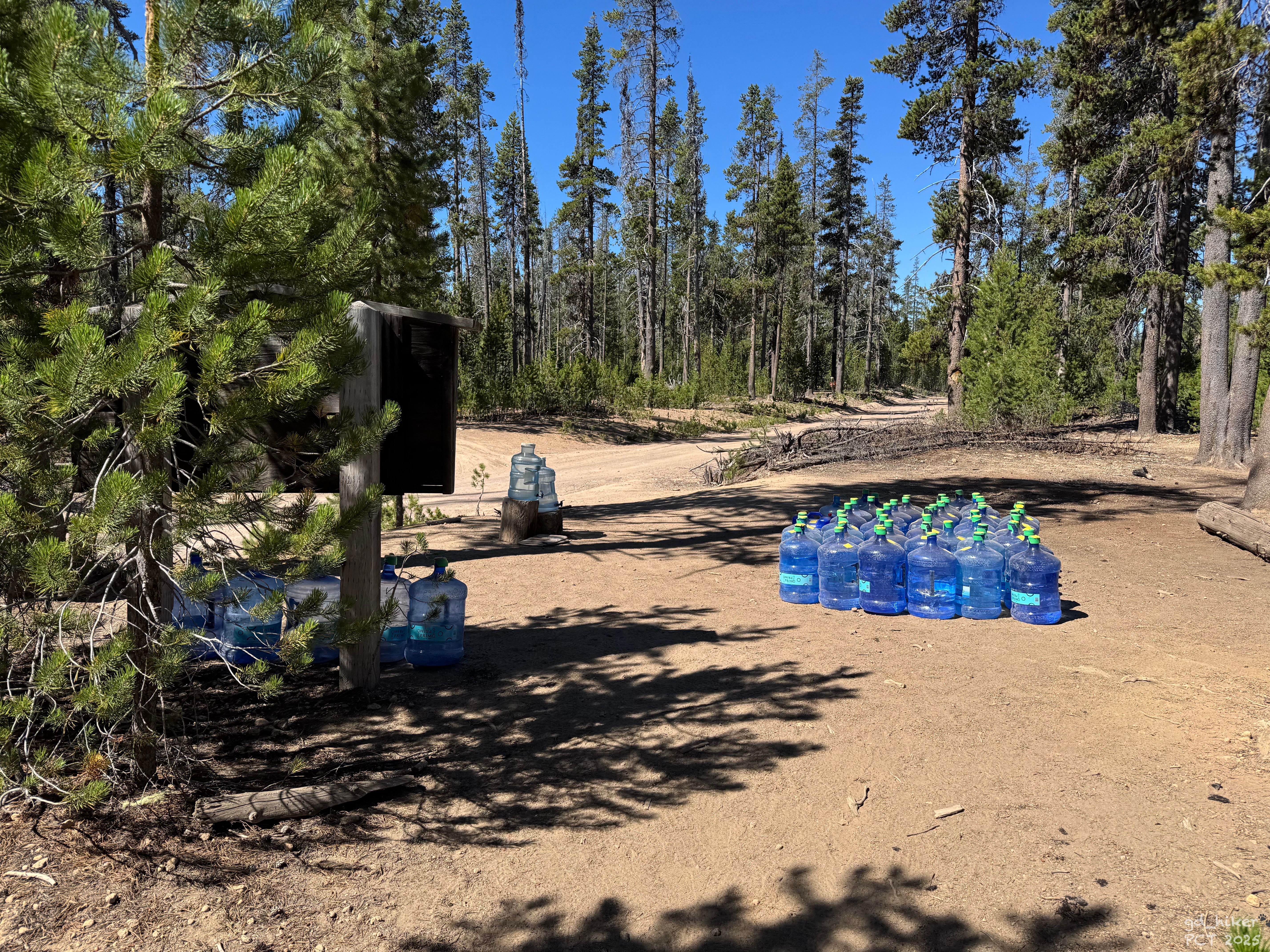 I literally “rolled” down the mountain, left the Mount Thielsen Wilderness behind, and reached a forest road. From a distance, I already spotted the familiar sight of water caches waiting at the trailhead – large transparent bottles filled with water.