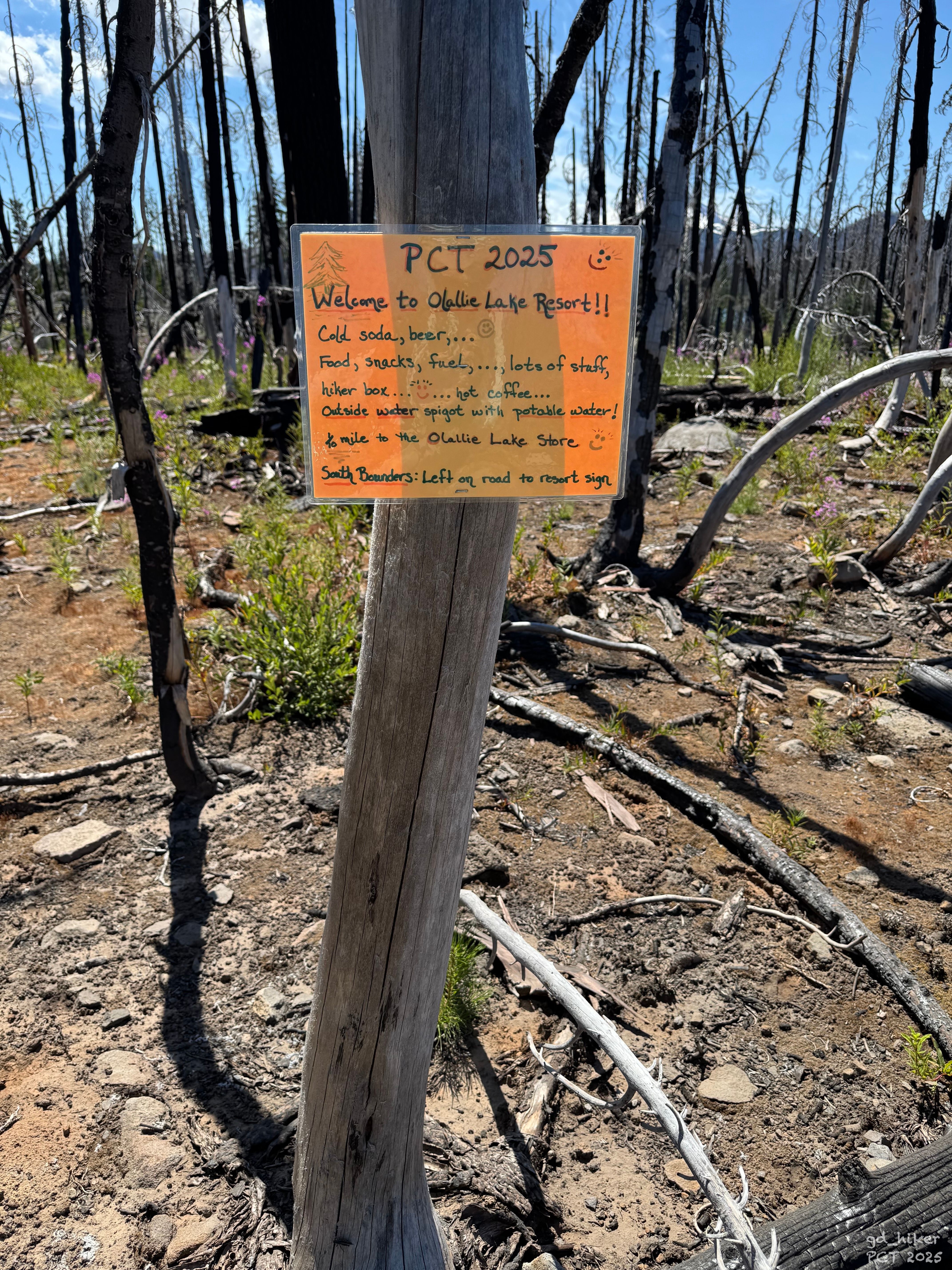 About an hour later, an orange sign pointed me toward the resort. To get there, I had to leave the PCT and walk a stretch along a dirt road. I gladly accepted the small detour.