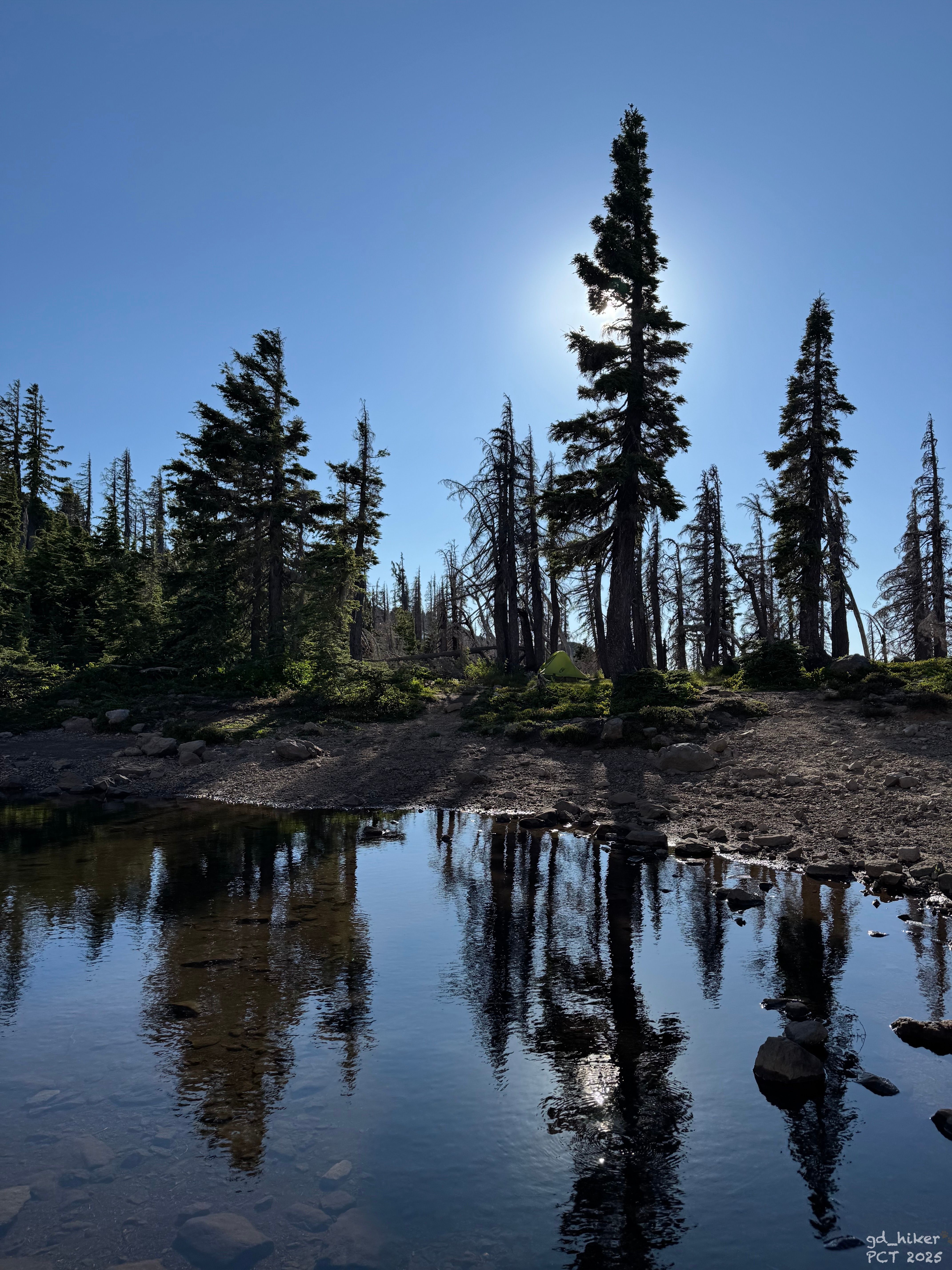 An einem See füllte ich noch Wasser auf, da mir kein NOBO-Wanderer wirklich bestätigen konnte, dass es vor dem Mt. Jefferson noch eine Wasserquelle gab – auch FarOut war da nicht eindeutig.