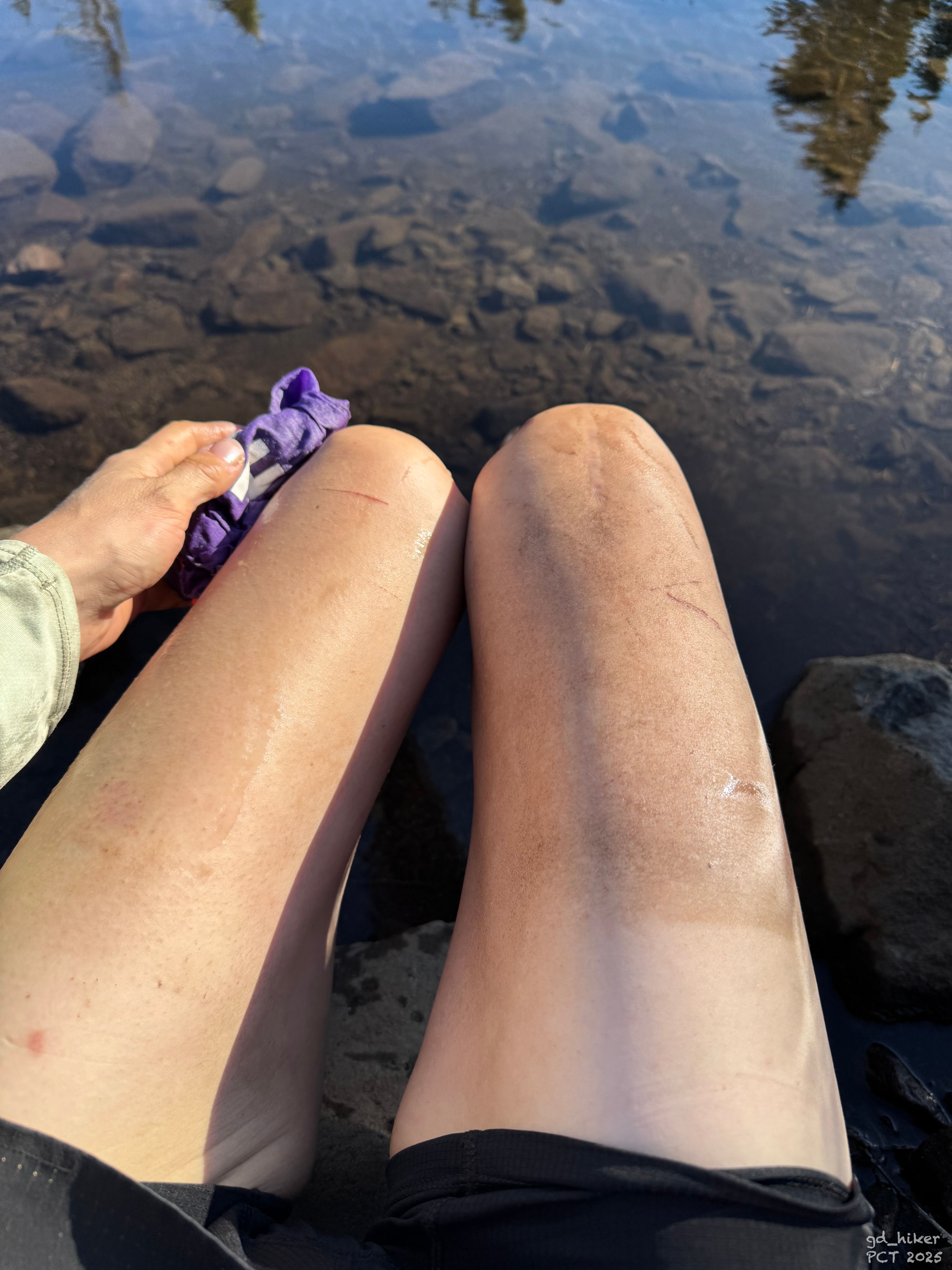After setting up my tent, I washed the dirt off my legs. The water was freezing, and putting my feet in the pond hurt badly.