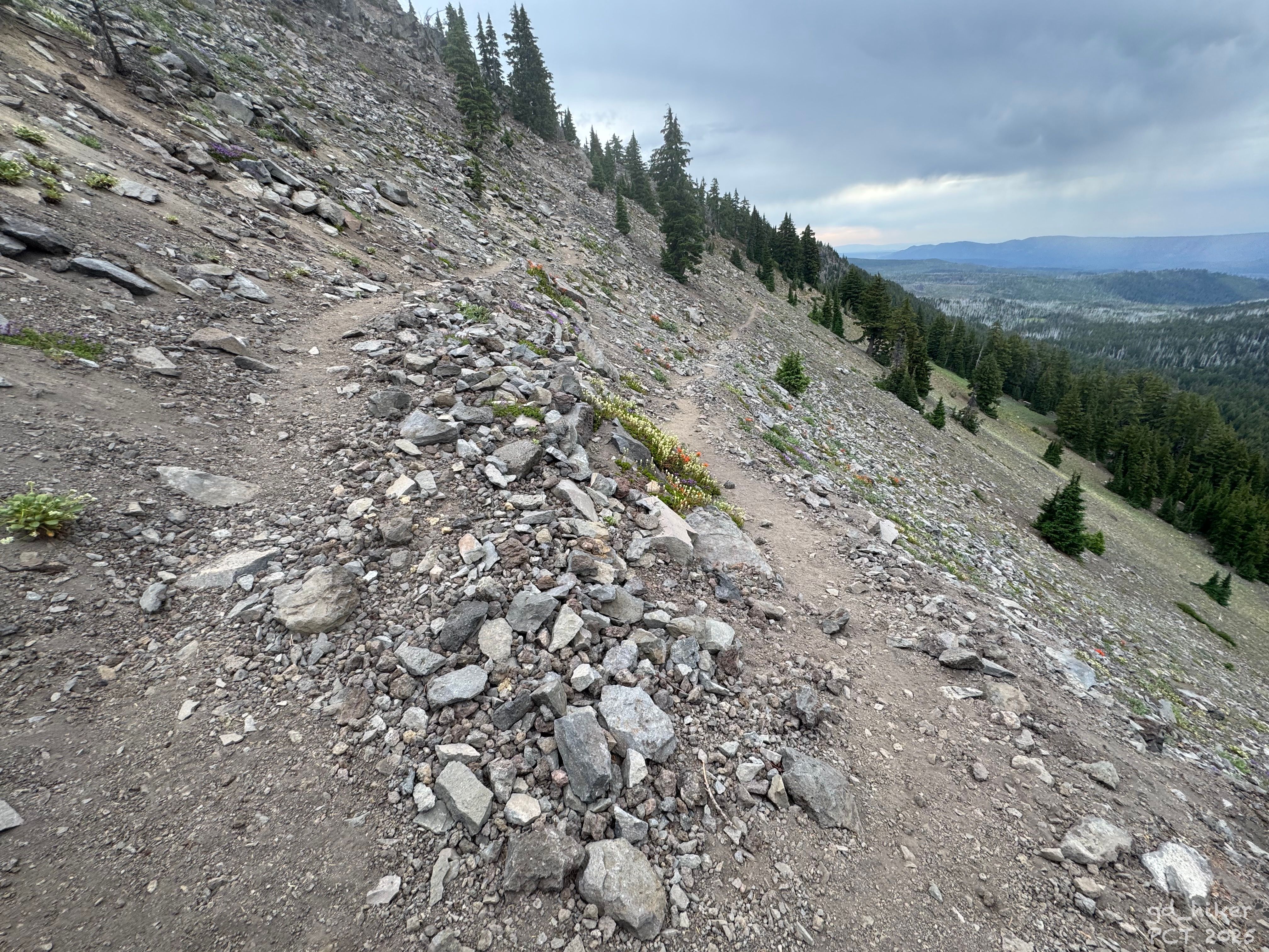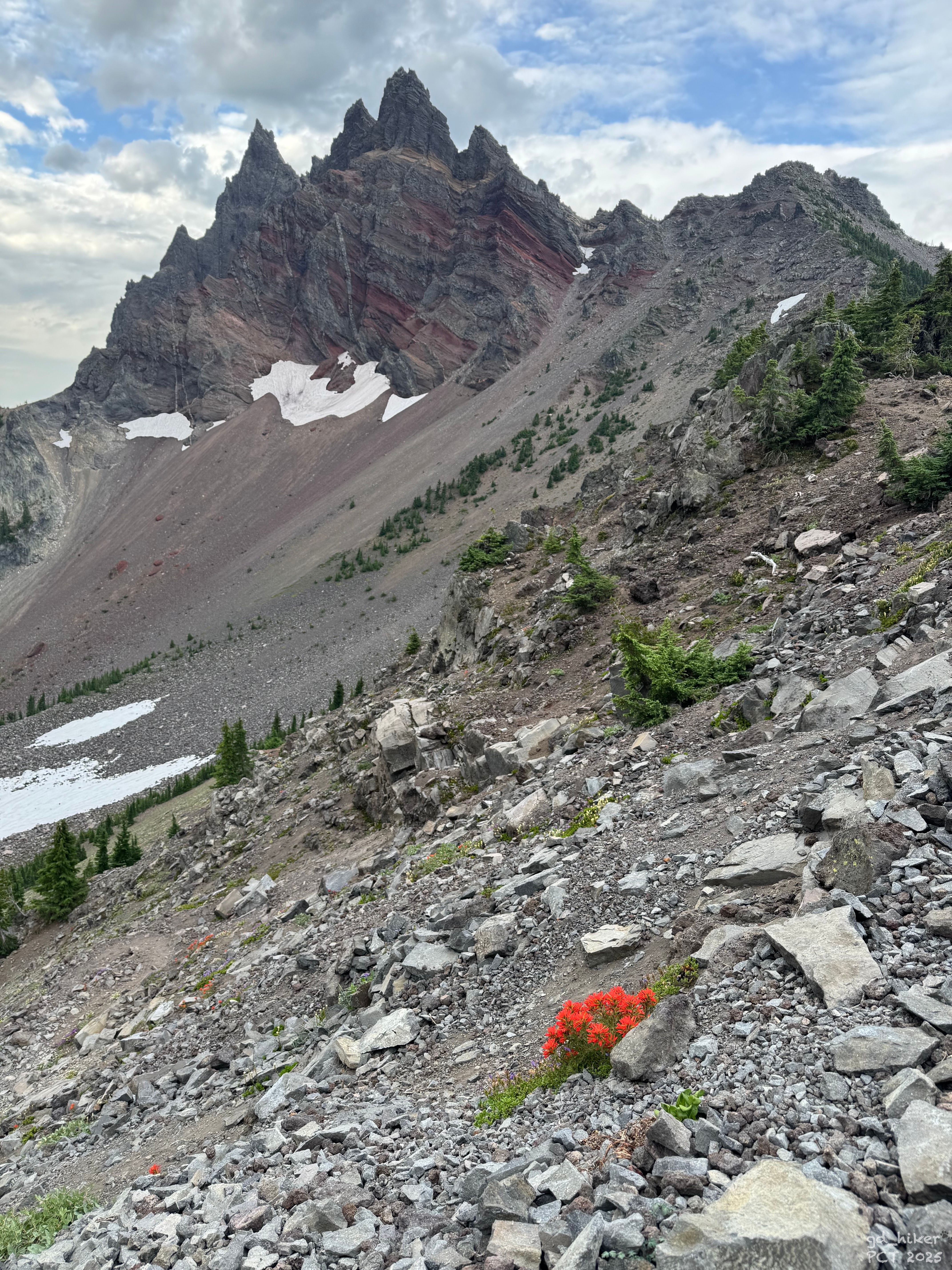 Unter einem wolkenverhangenen Himmel machte ich mich an die letzten Meter zum Three Fingered Jack. Sogar leichter Regen war angesagt.