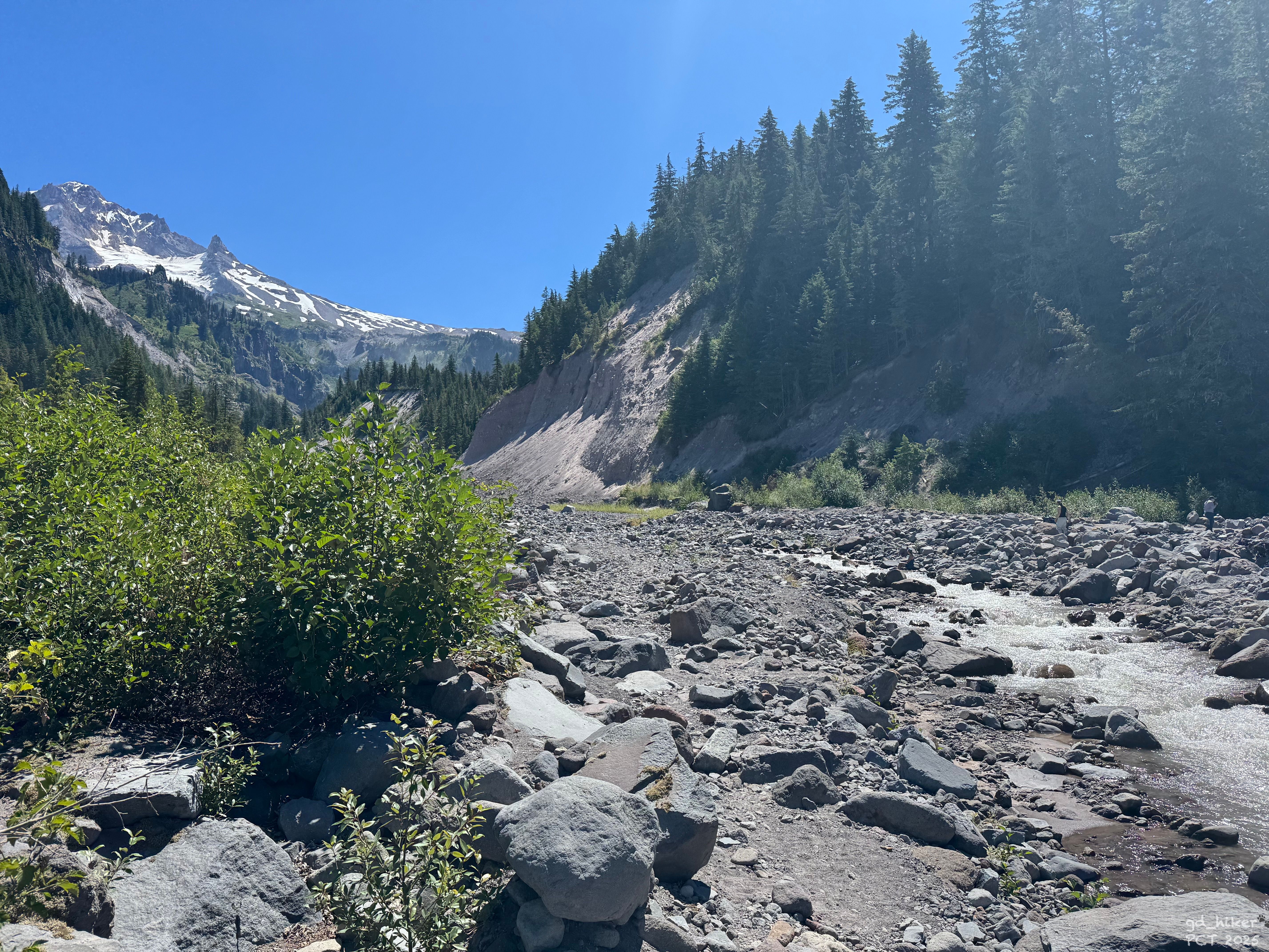On the other side, two hikers were sitting. One waved me off and pointed upstream. I couldn’t hear him because of the creek, but I followed his direction.