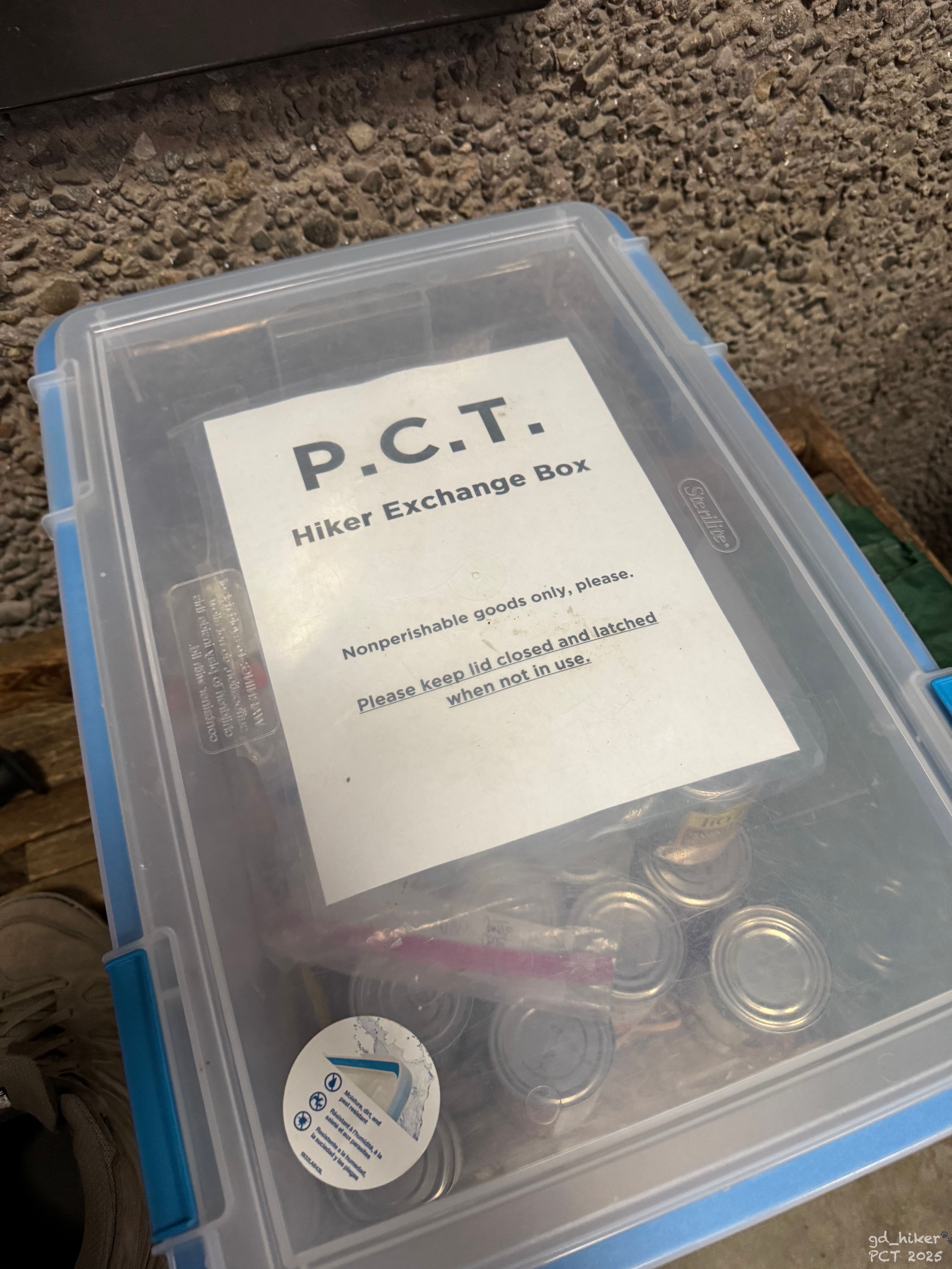 Ich bedankte mich und schlenderte zur Hiker Box. Hier waren aber nur Dosen drin, die ich jetzt nicht mitschleppen wollte. Auch zum Hieressen waren sie für mich ungeeignet, denn ich hatte keinen Dosenöffner dabei.