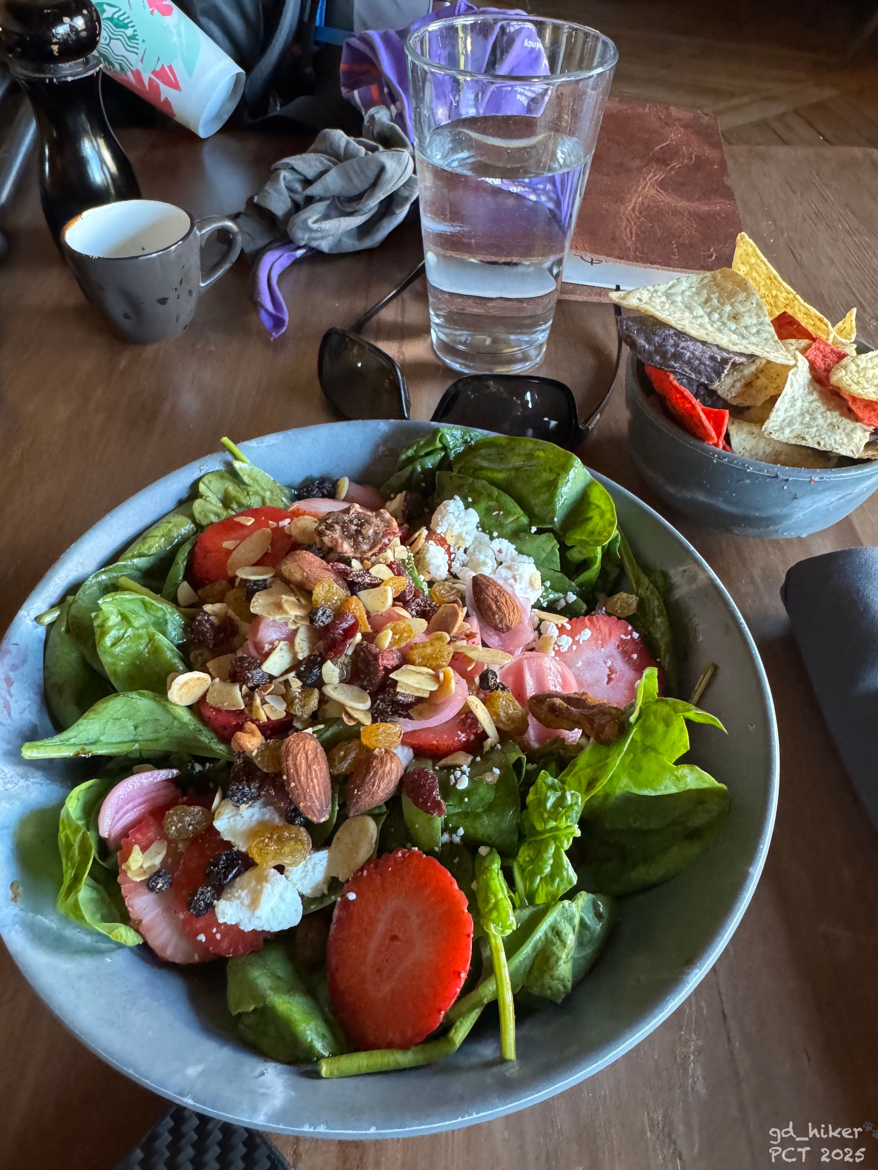 Die Karte war ziemlich gehoben, aber ich entdeckte einen Salat – frisches Essen fehlt mir auf dem Trail wirklich.