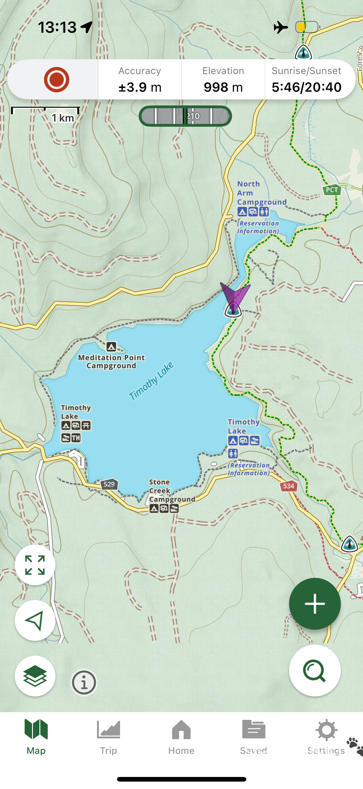 Um 11:00 Uhr legte ich meine Lunchpause am Crater Creek ein und stellte mein Solarpanel in die Sonne. Da ich die meiste Zeit unter den Baumkronen im Schatten lief, bekam meine Powerbank kaum neue Energie.