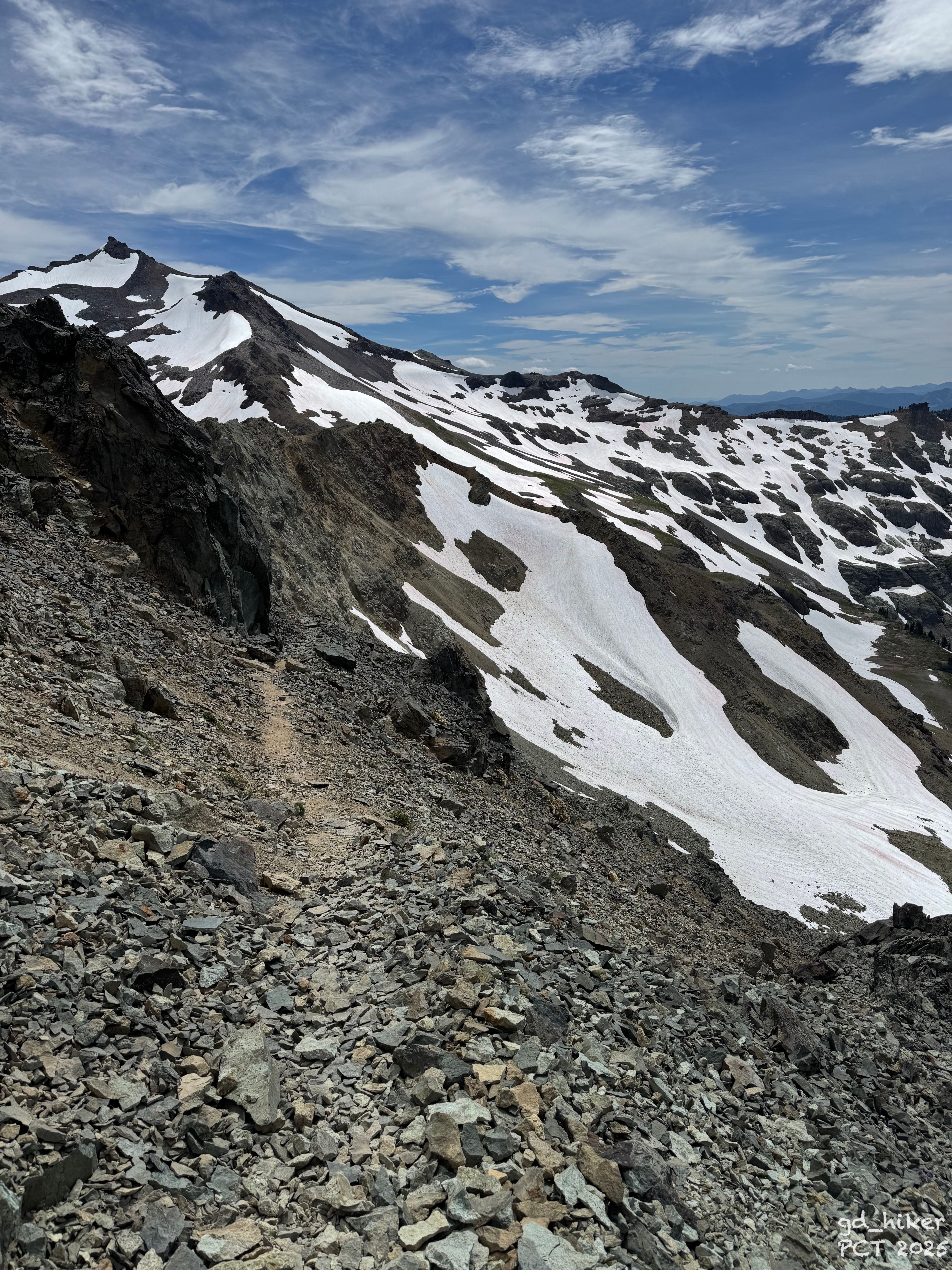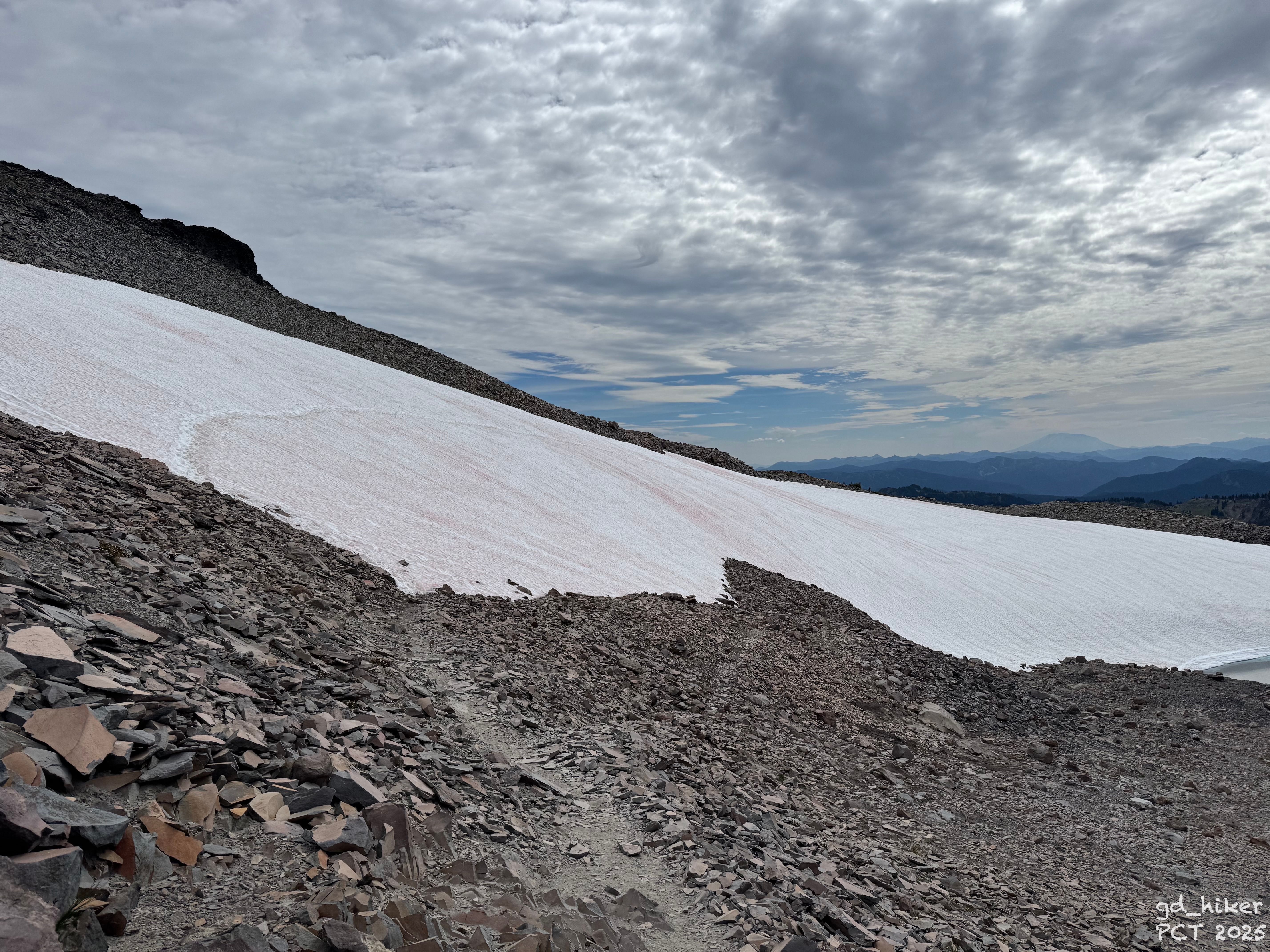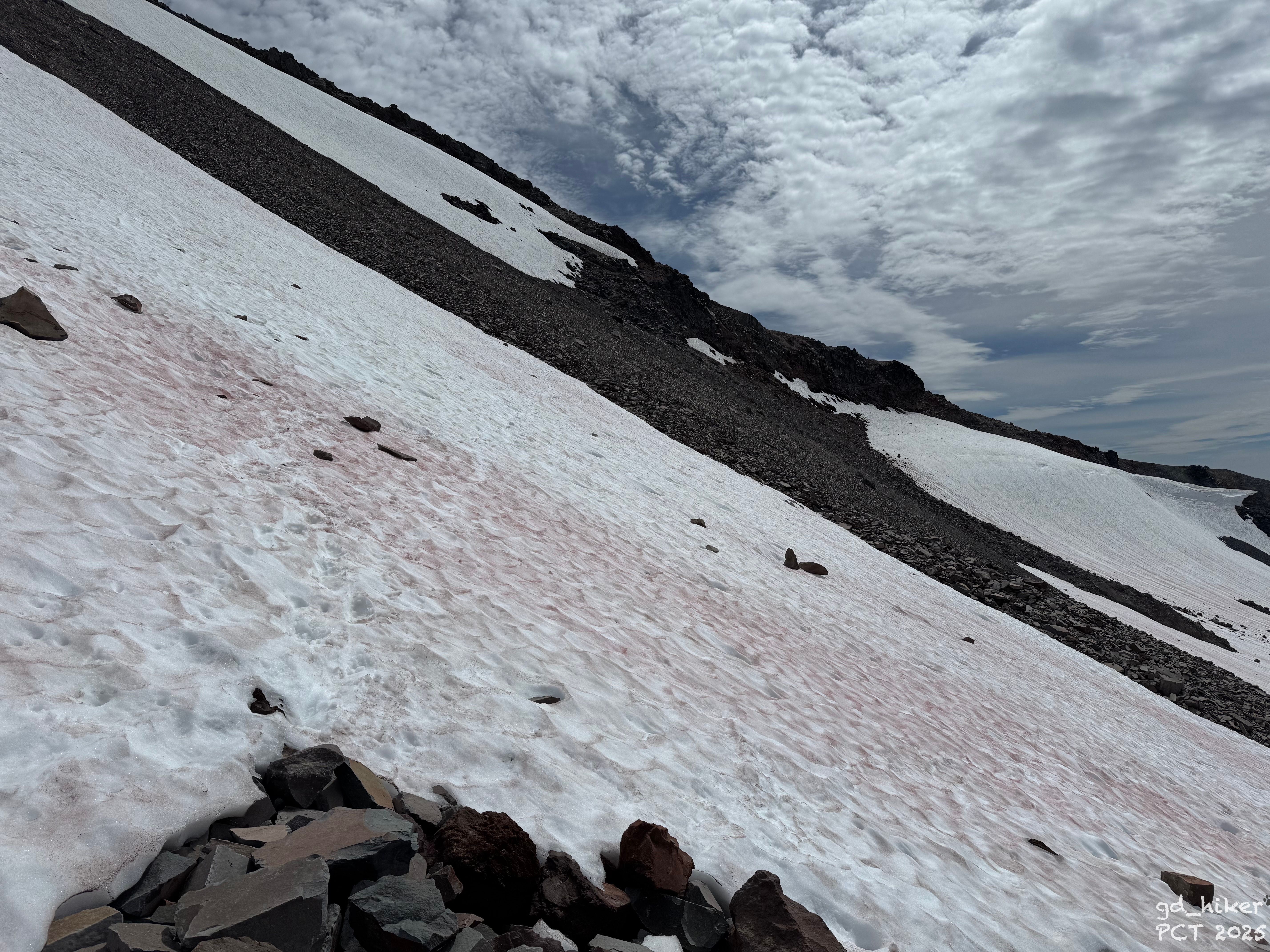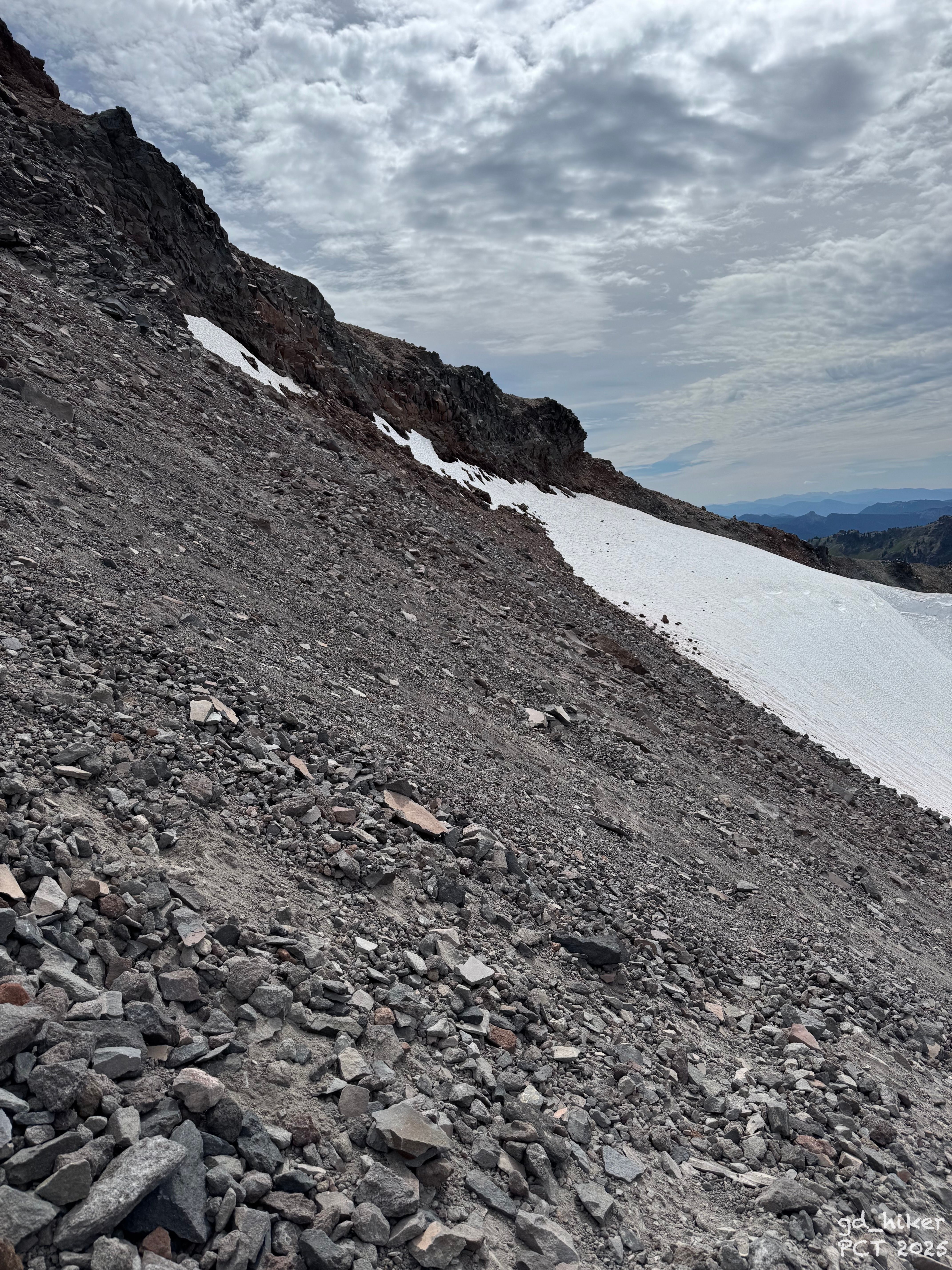 Even worse than the snowfields was the sandy rock that followed. Every step slid me a little down the slope—the scree offered almost no traction.