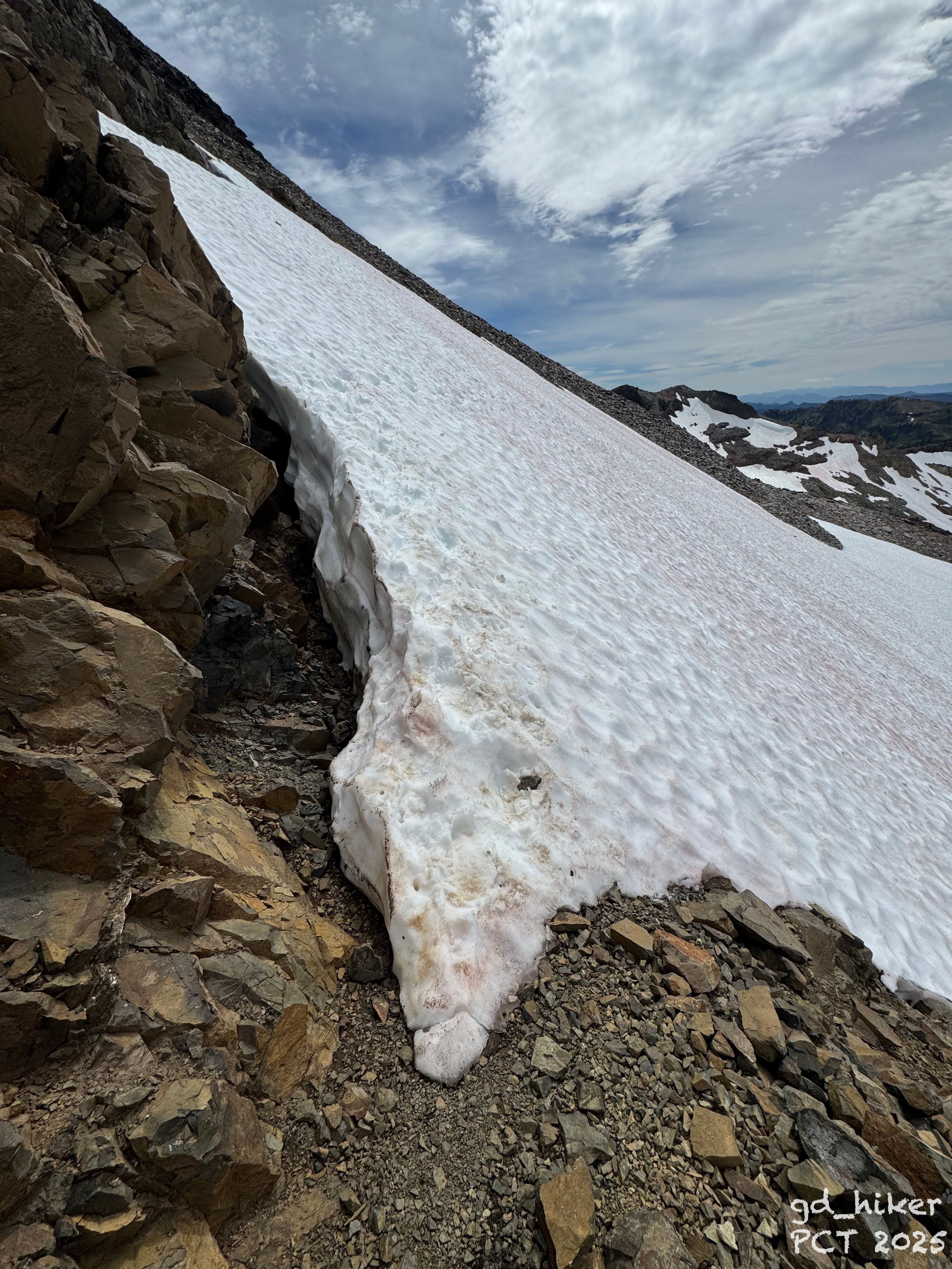 The trail disappeared under a long snowfield that sloped toward the edge of the ridge.