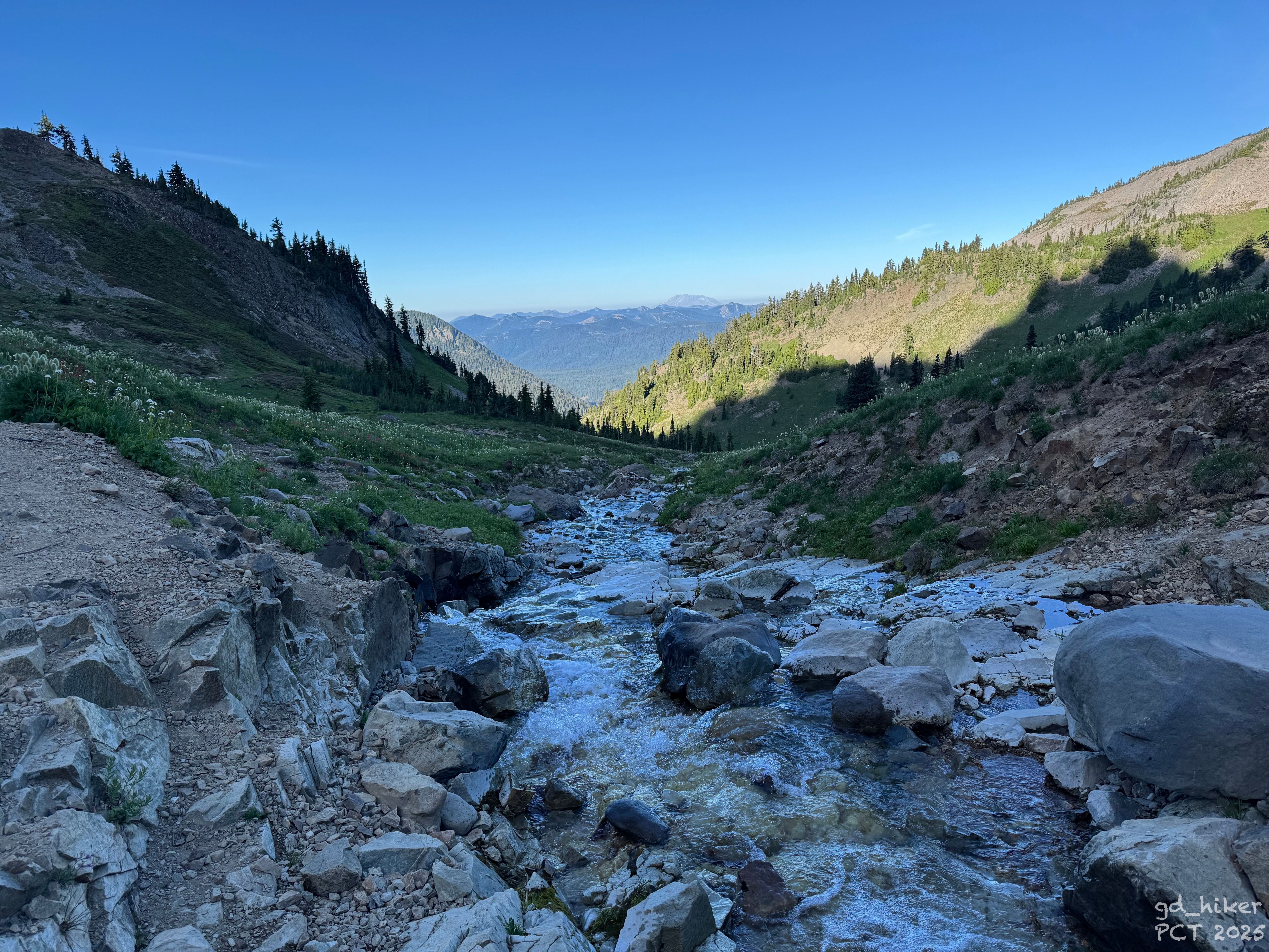 Cispus Creek tumbled over the trail in a small waterfall, and in the surrounding slopes, I spotted a few other hikers’ tents here and there.