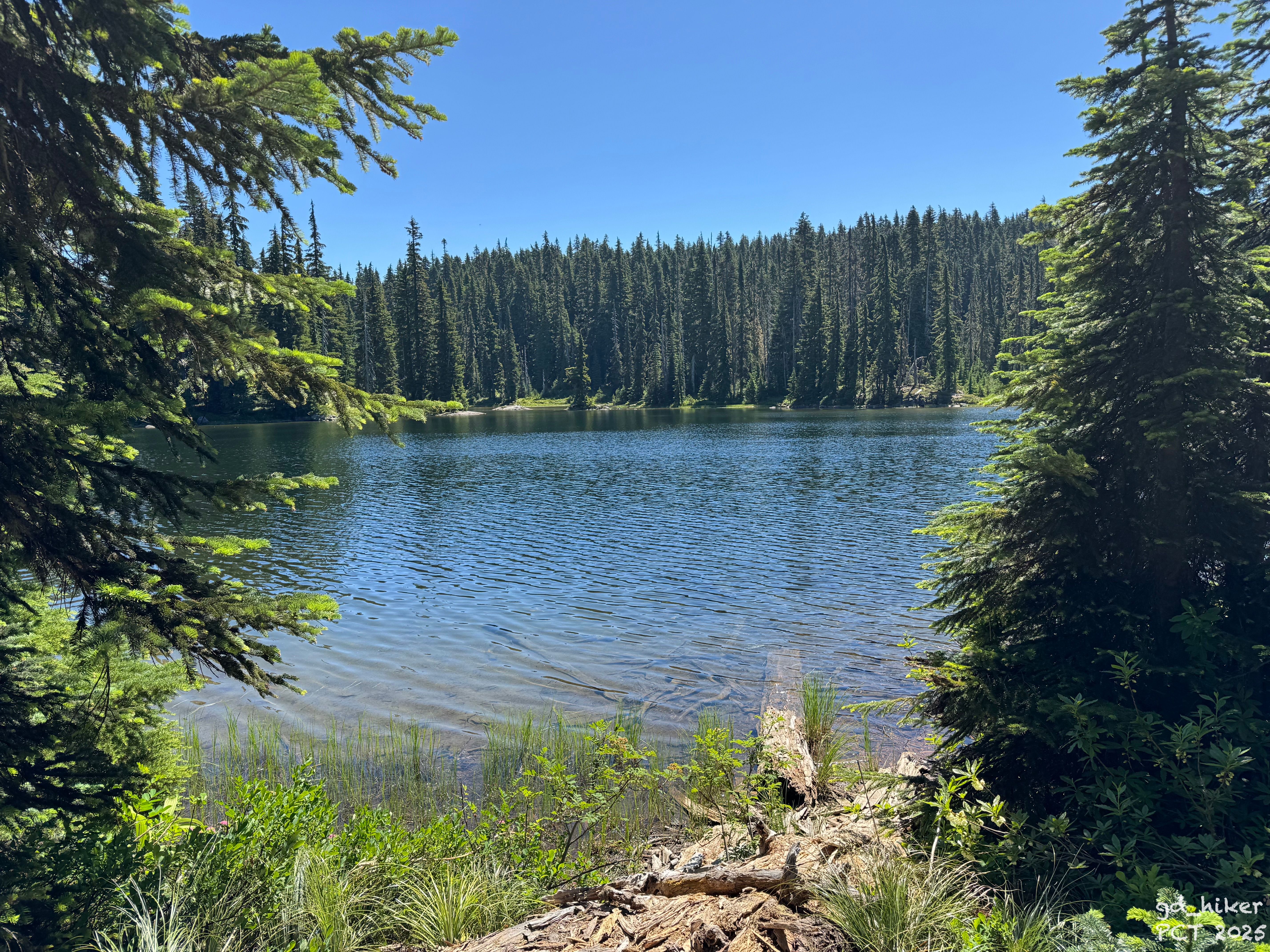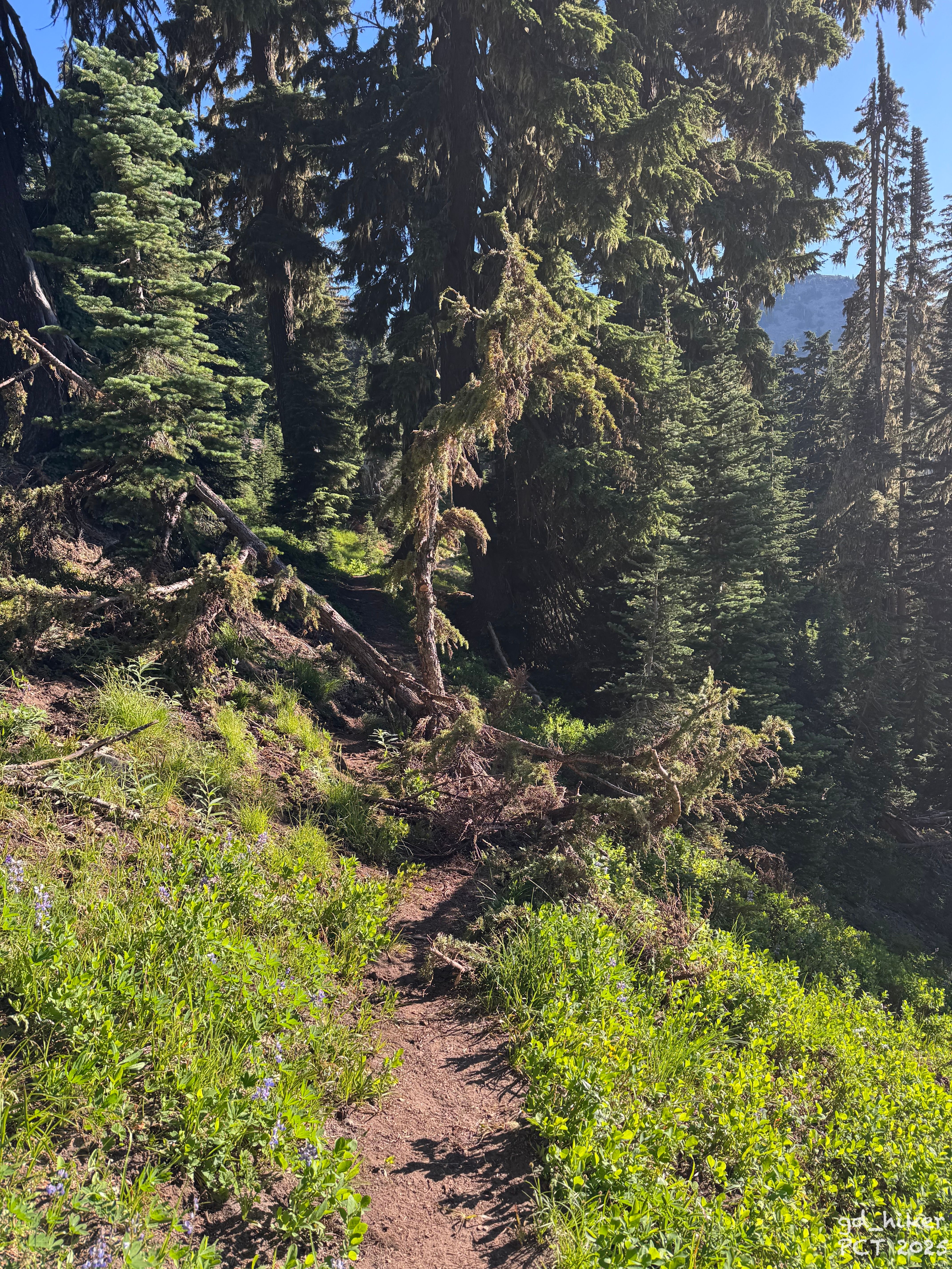 I hadn’t thought I would see him again today.Aside from that, the trail welcomed me with a few fallen trees and a gentle climb. Soon, Mount St. Helens joined Mount Rainier on the horizon, the volcano growing more and more dominant.