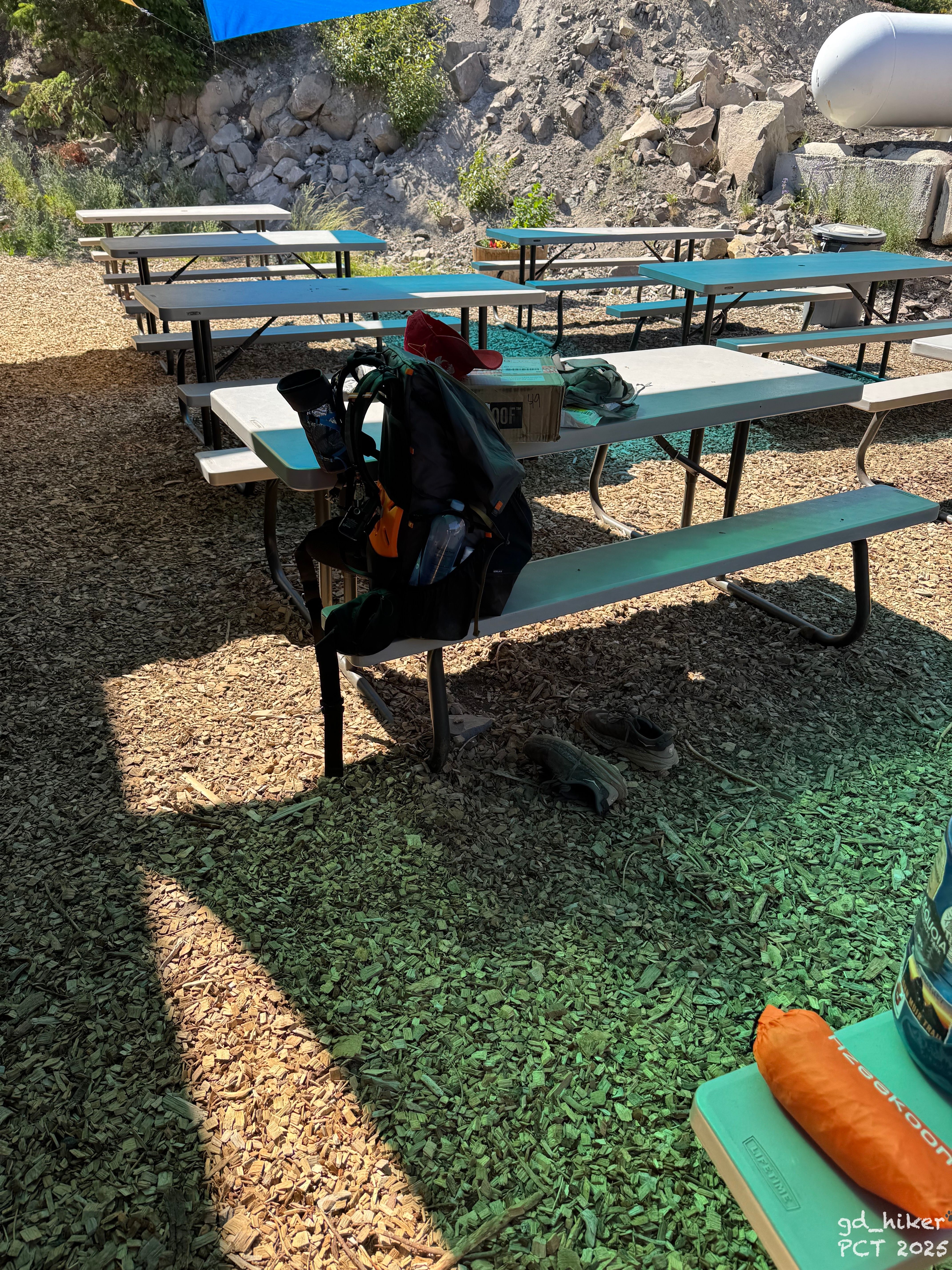 Sie zeigten mir auch, wo die Hiker sich aufhielten. Hinter dem Shop standen Tische mit Sonnenschutz, dahinter war eine große Zeltfläche – komplett leer.