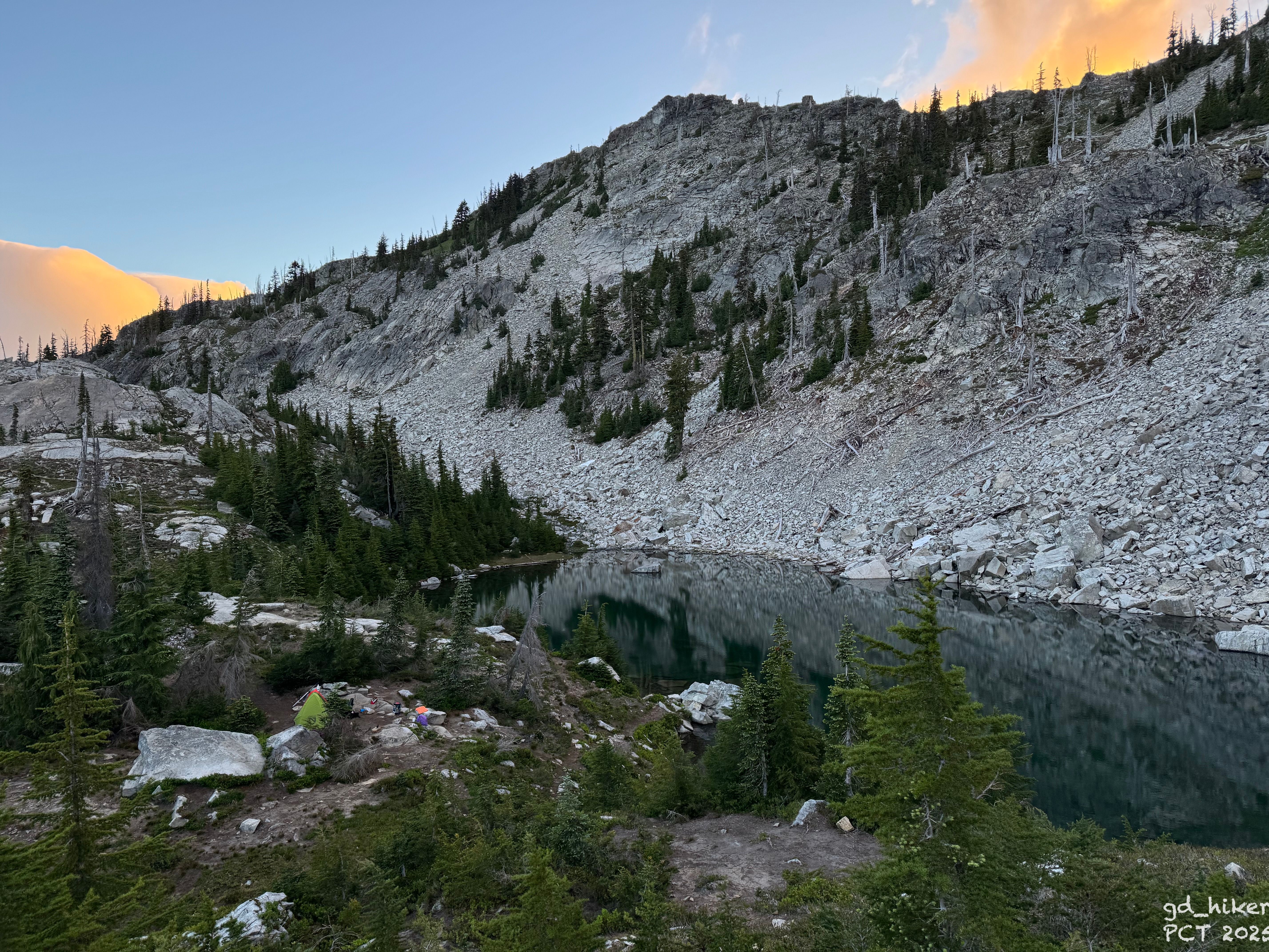 I got up and followed the trail around the lake. I passed several spots until I finally found one I liked — right by the water, with flat ground.