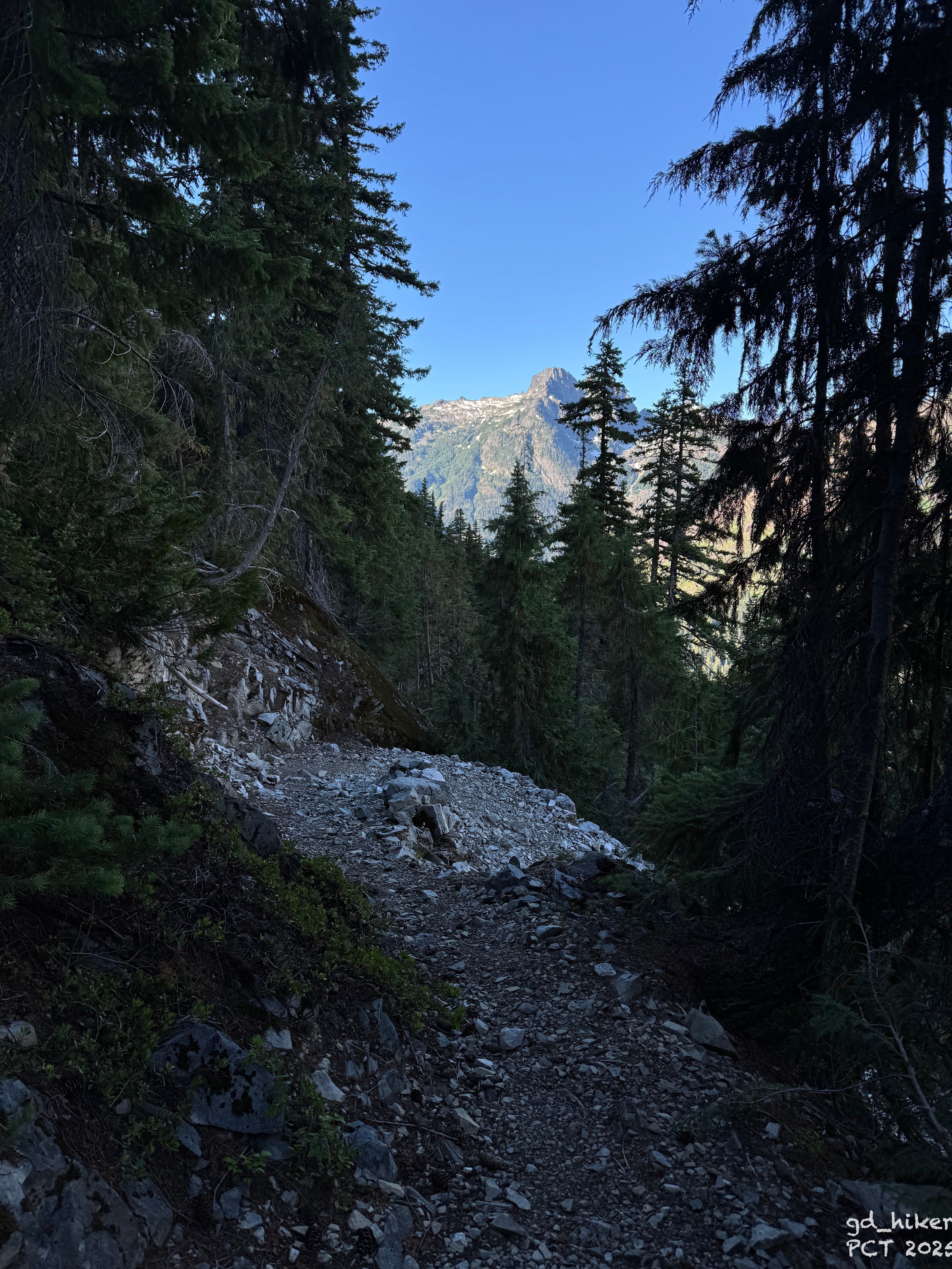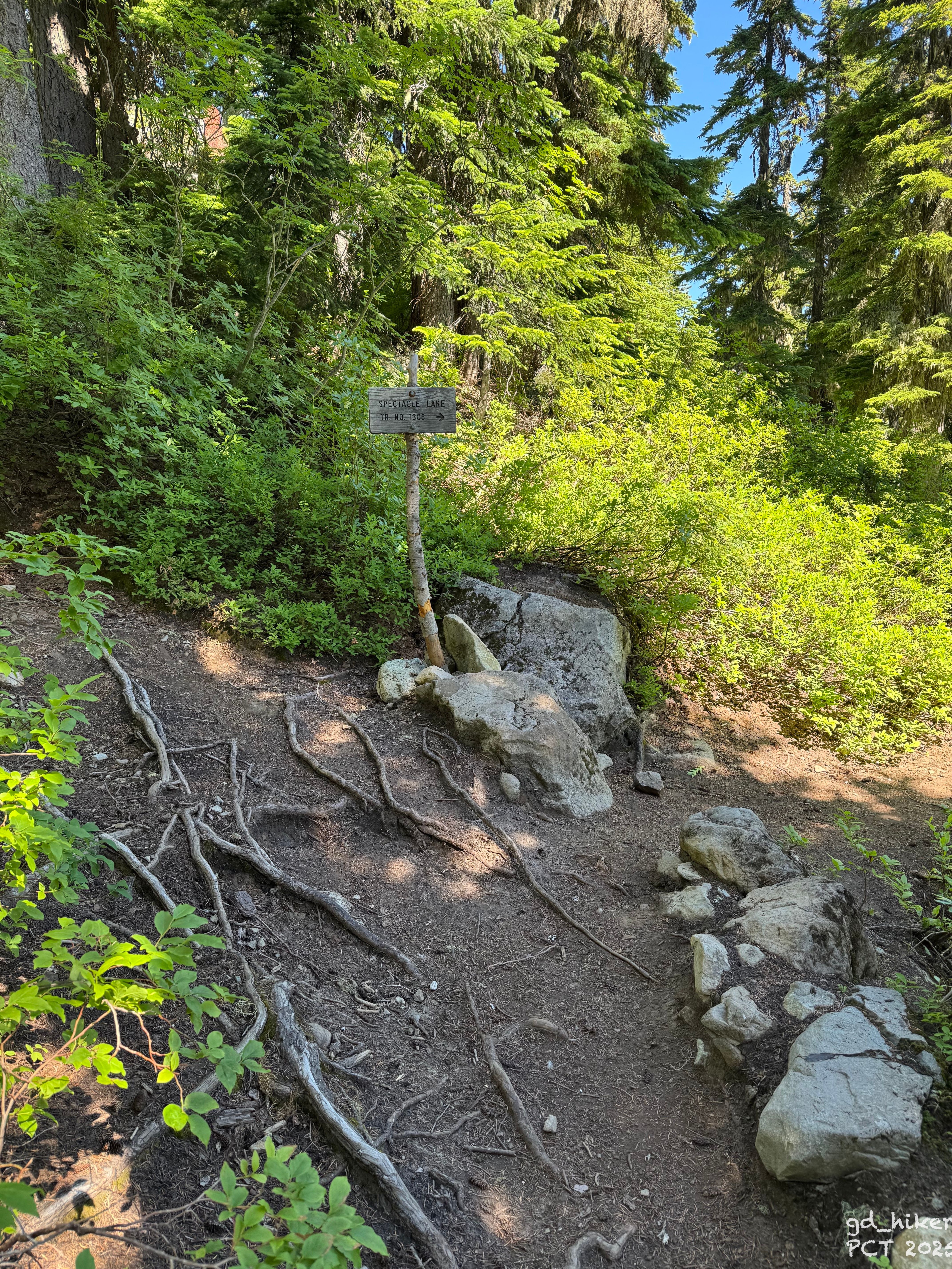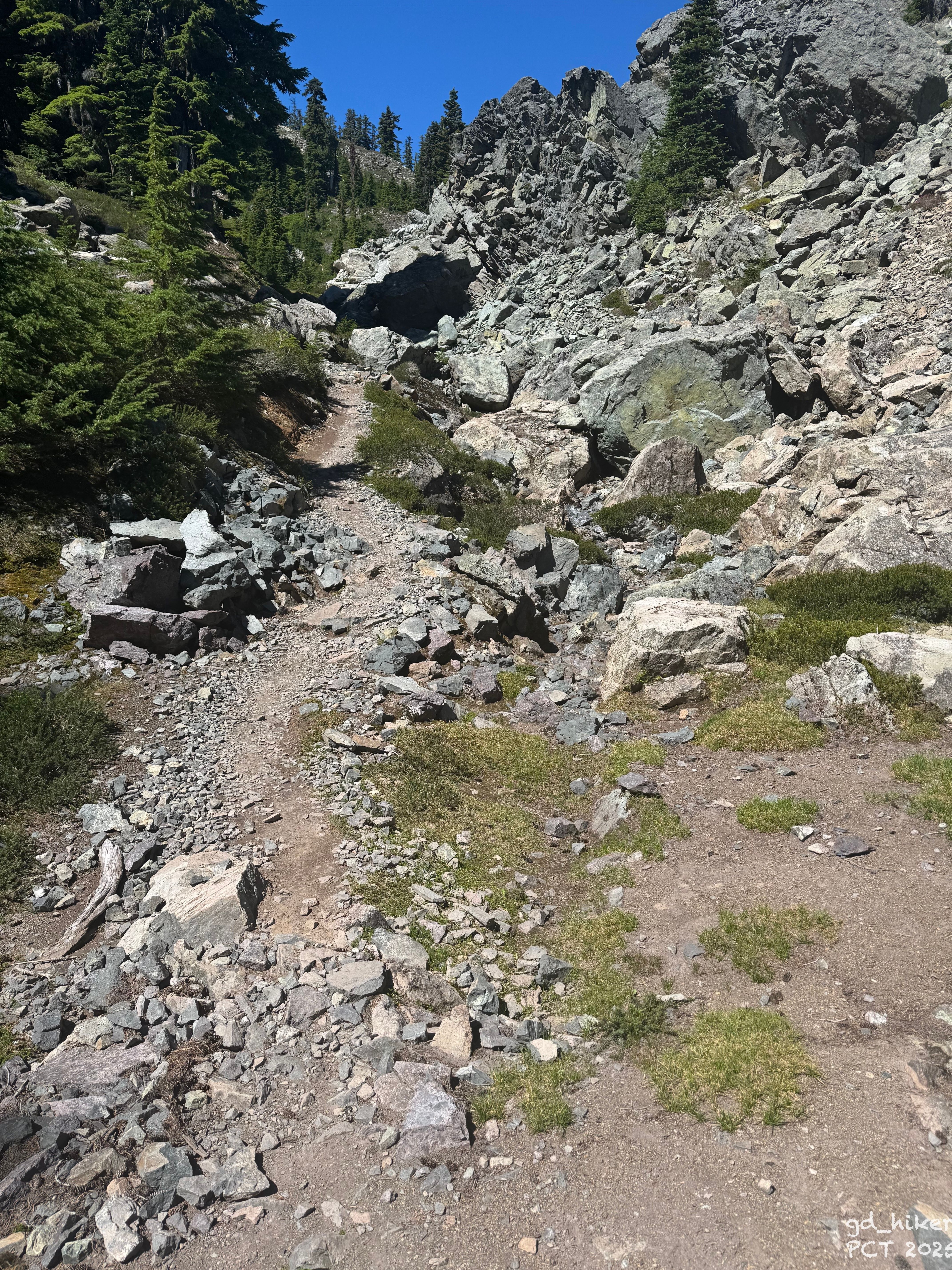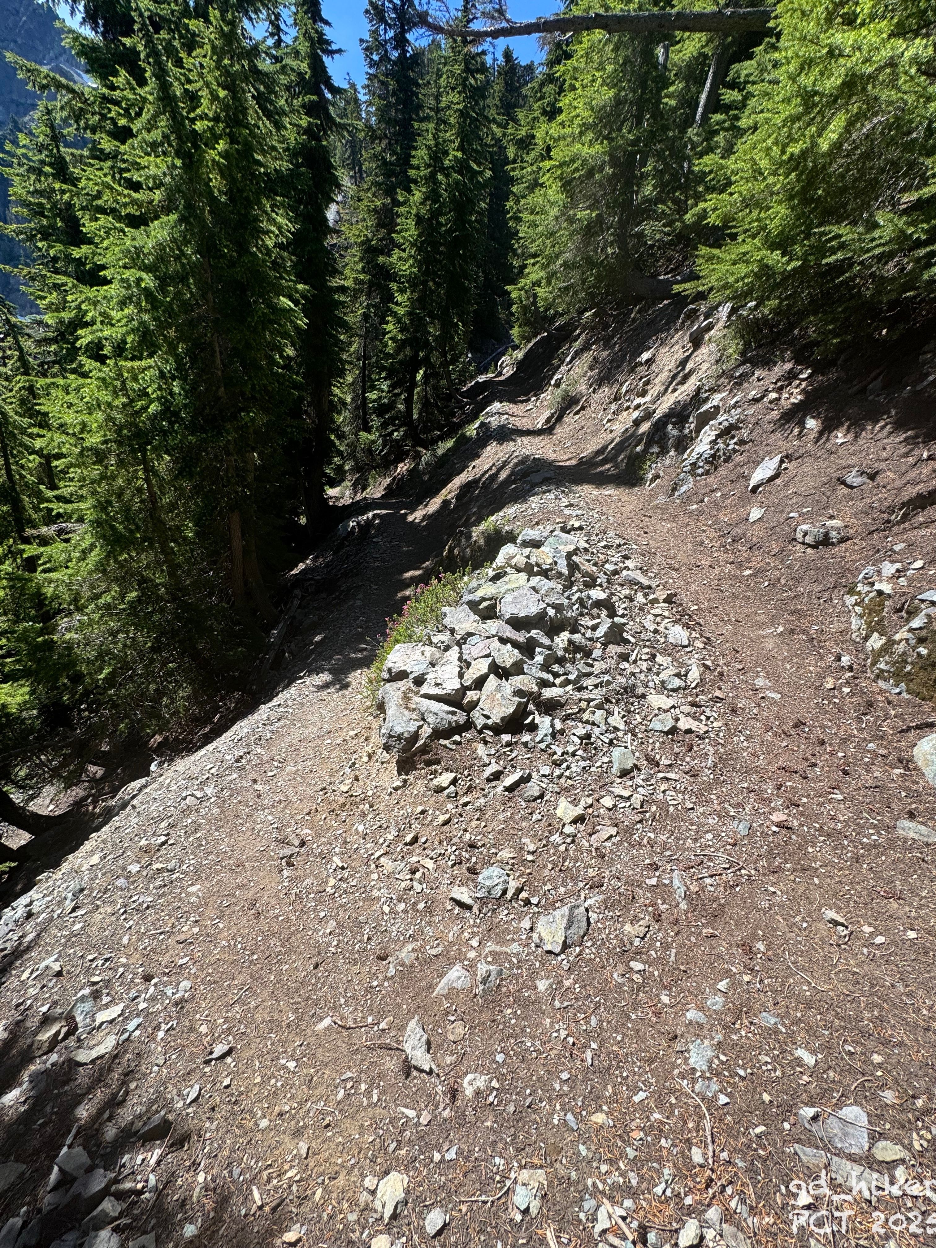 Eigentlich wollte ich am Wasserfall eine Snackpause einlegen, doch es gab keine Möglichkeit, mich am Wegesrand niederzulassen. Also ging ich weiter. Nach ein paar weiteren Switchbacks erreichte ich eine Junction, und dort stand ein einzelner Stein.
