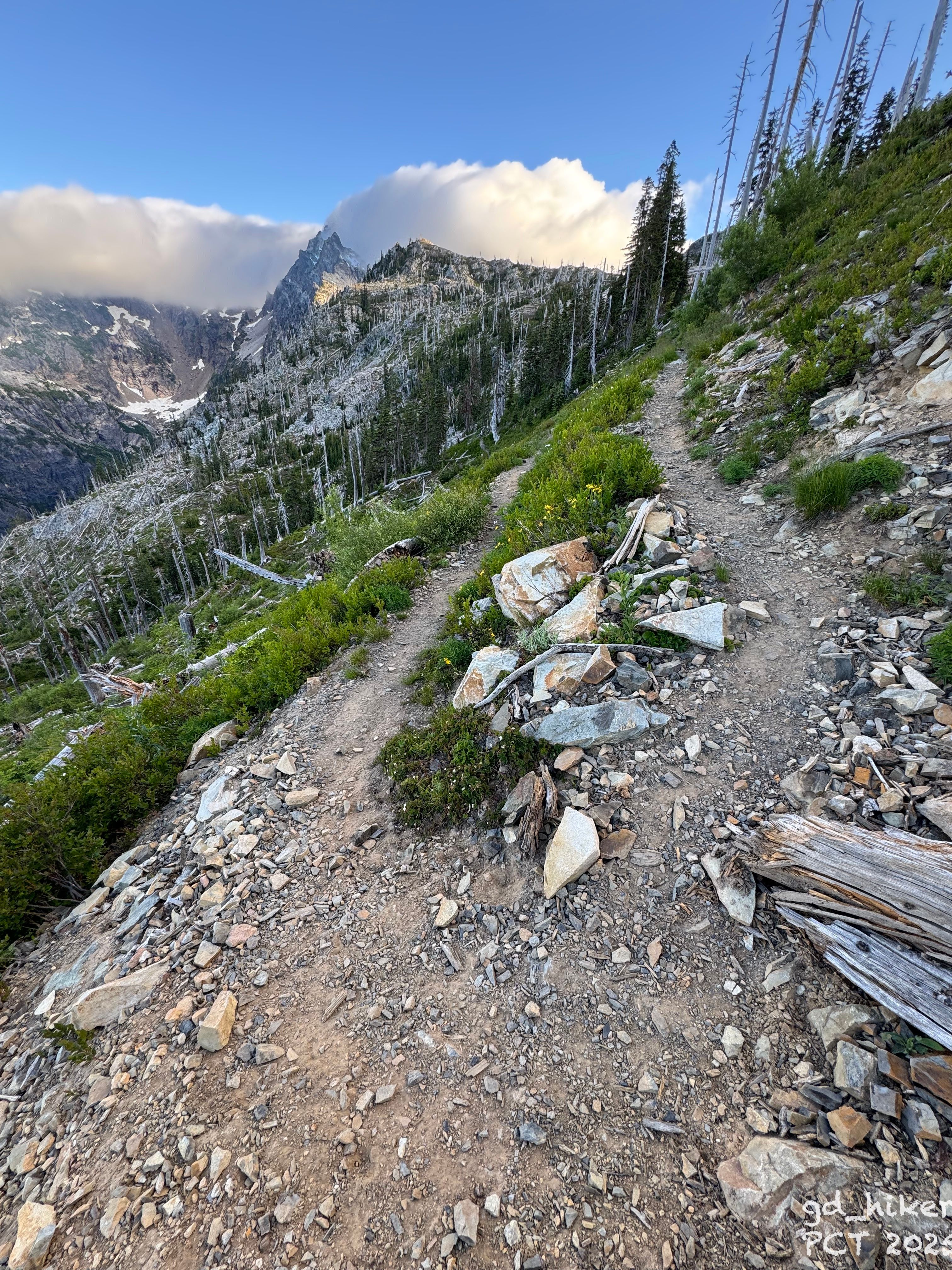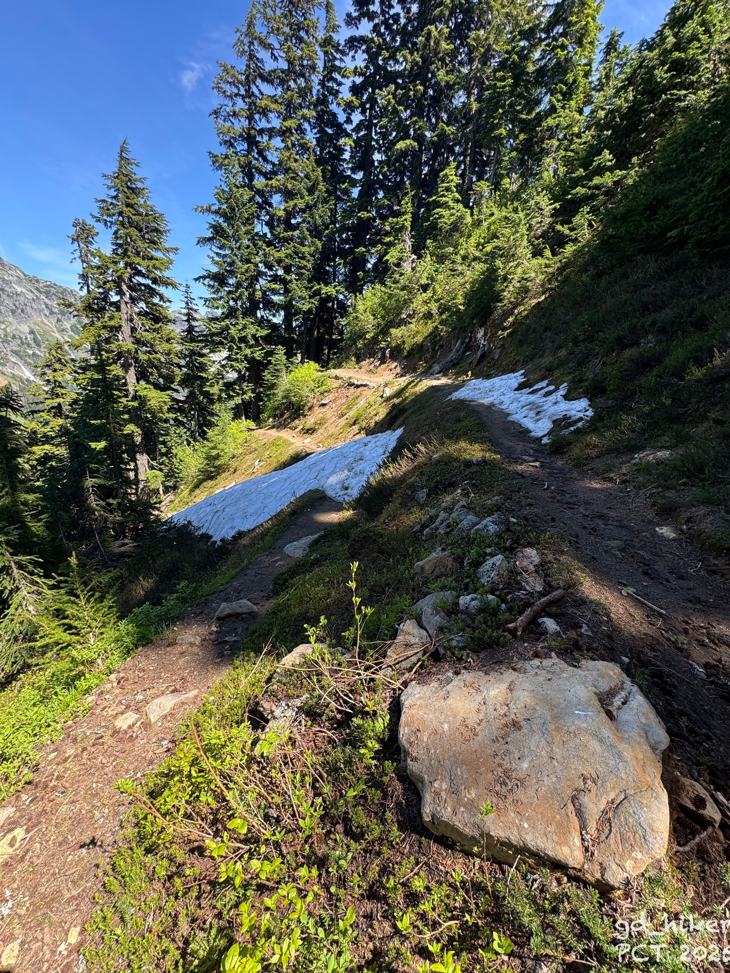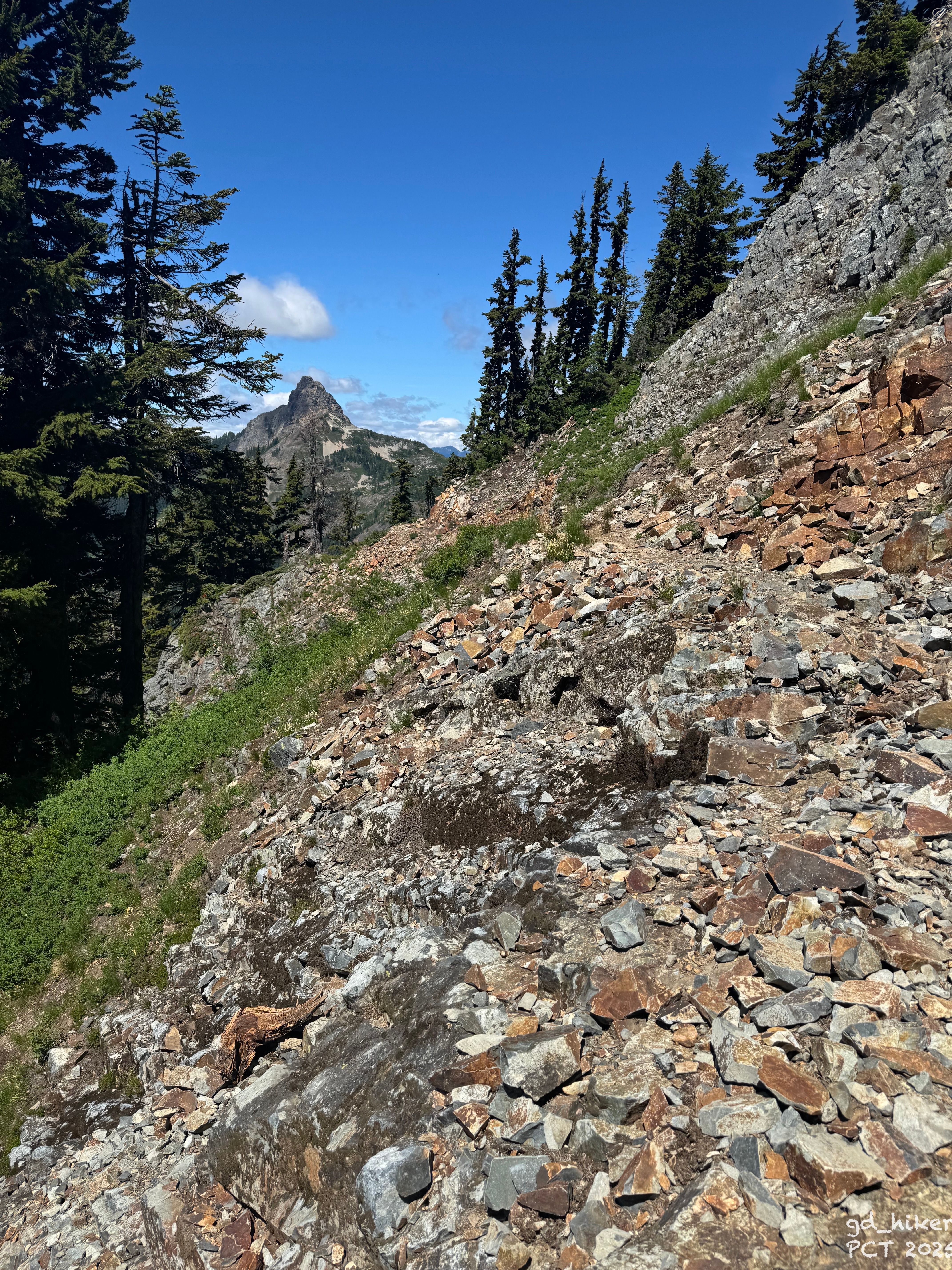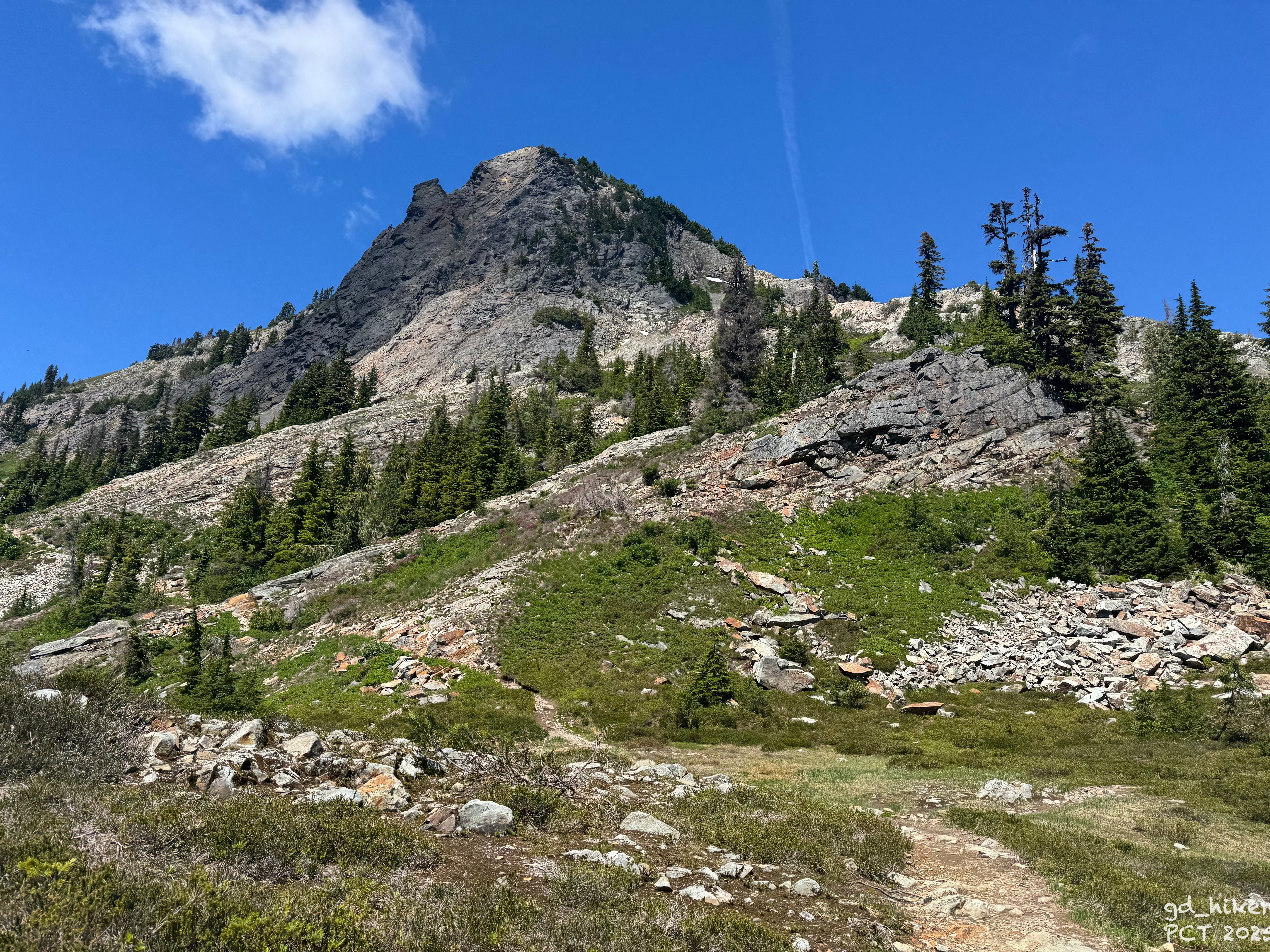 Eigentlich wollte ich am Wasserfall eine Snackpause einlegen, doch es gab keine Möglichkeit, mich am Wegesrand niederzulassen. Also ging ich weiter. Nach ein paar weiteren Switchbacks erreichte ich eine Junction, und dort stand ein einzelner Stein.