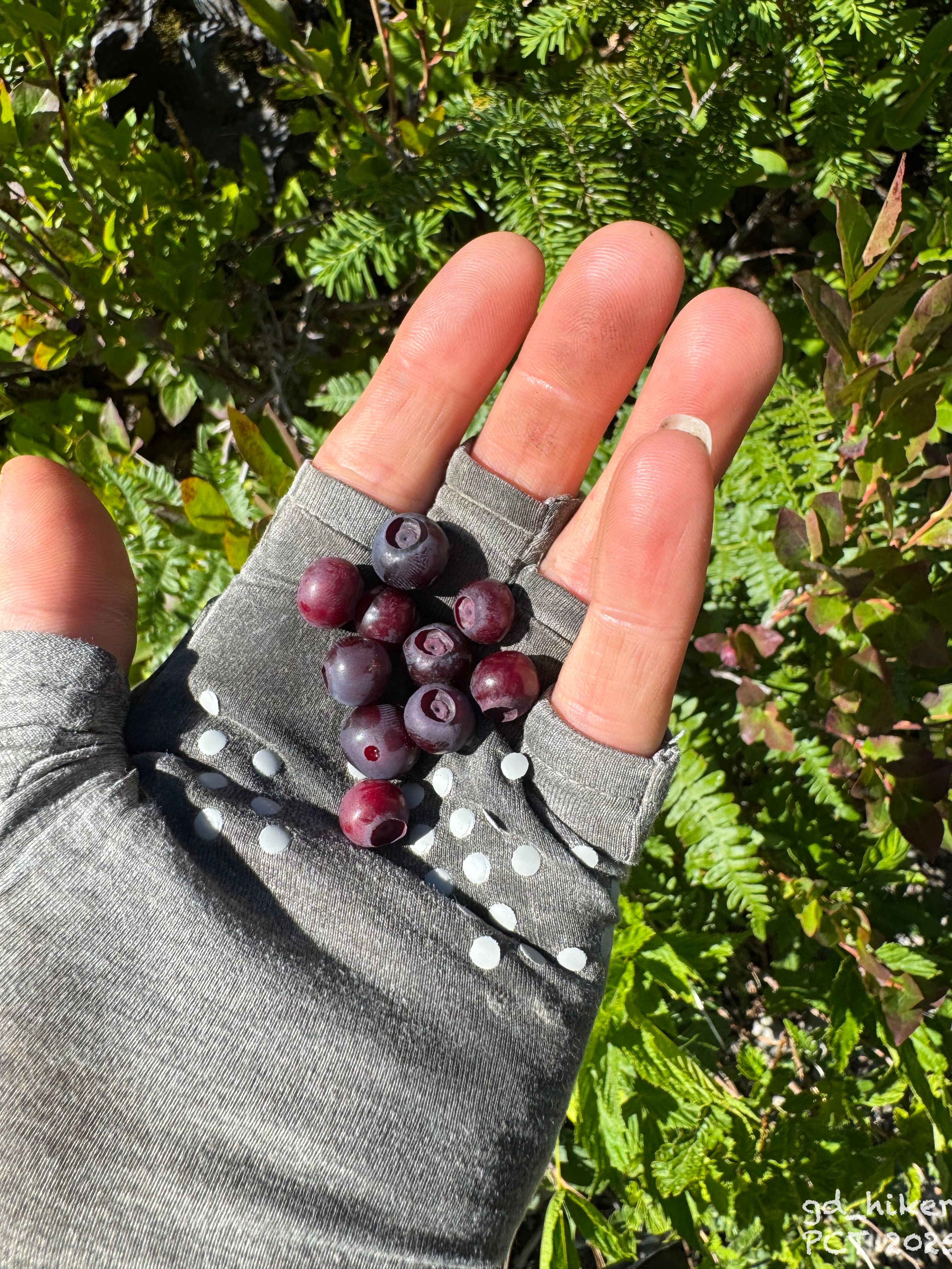 Ich begegnete zwei anderen Wanderern, die nach Norden unterwegs waren. Sie blieben stehen und pflĂĽckten die blauen Beeren von den BĂĽschen am Wegesrand, die mir zuvor ebenfalls aufgefallen waren.