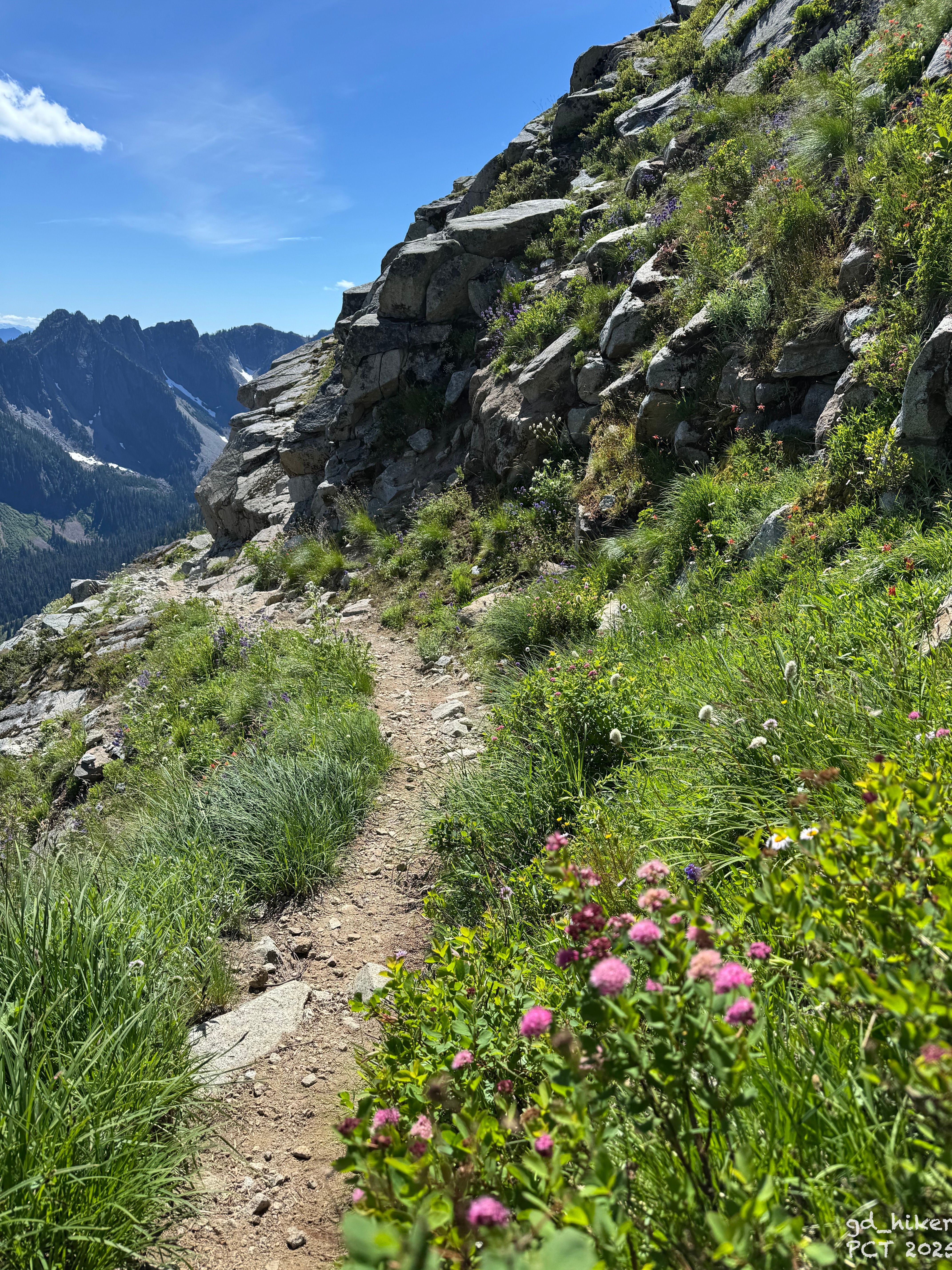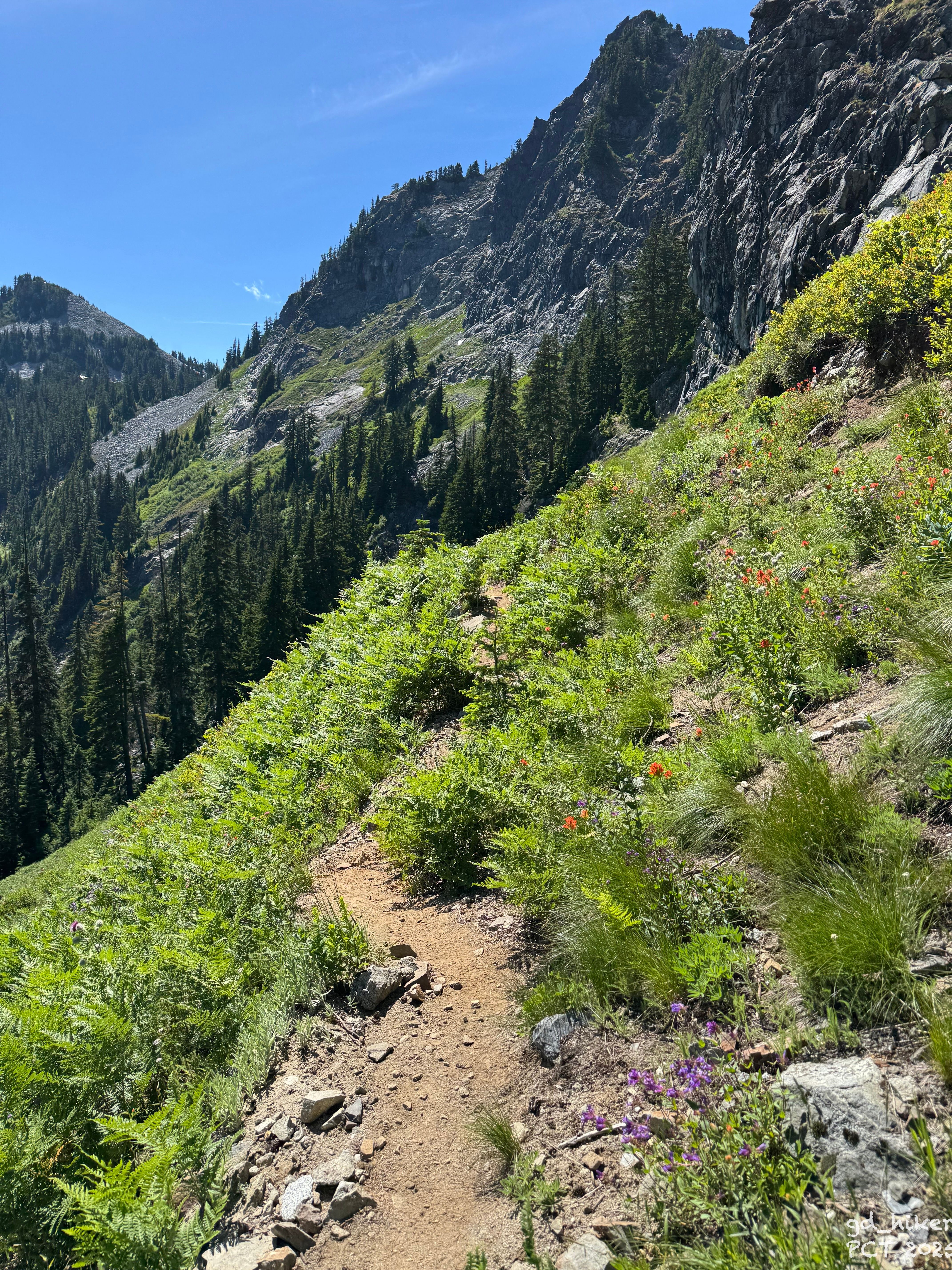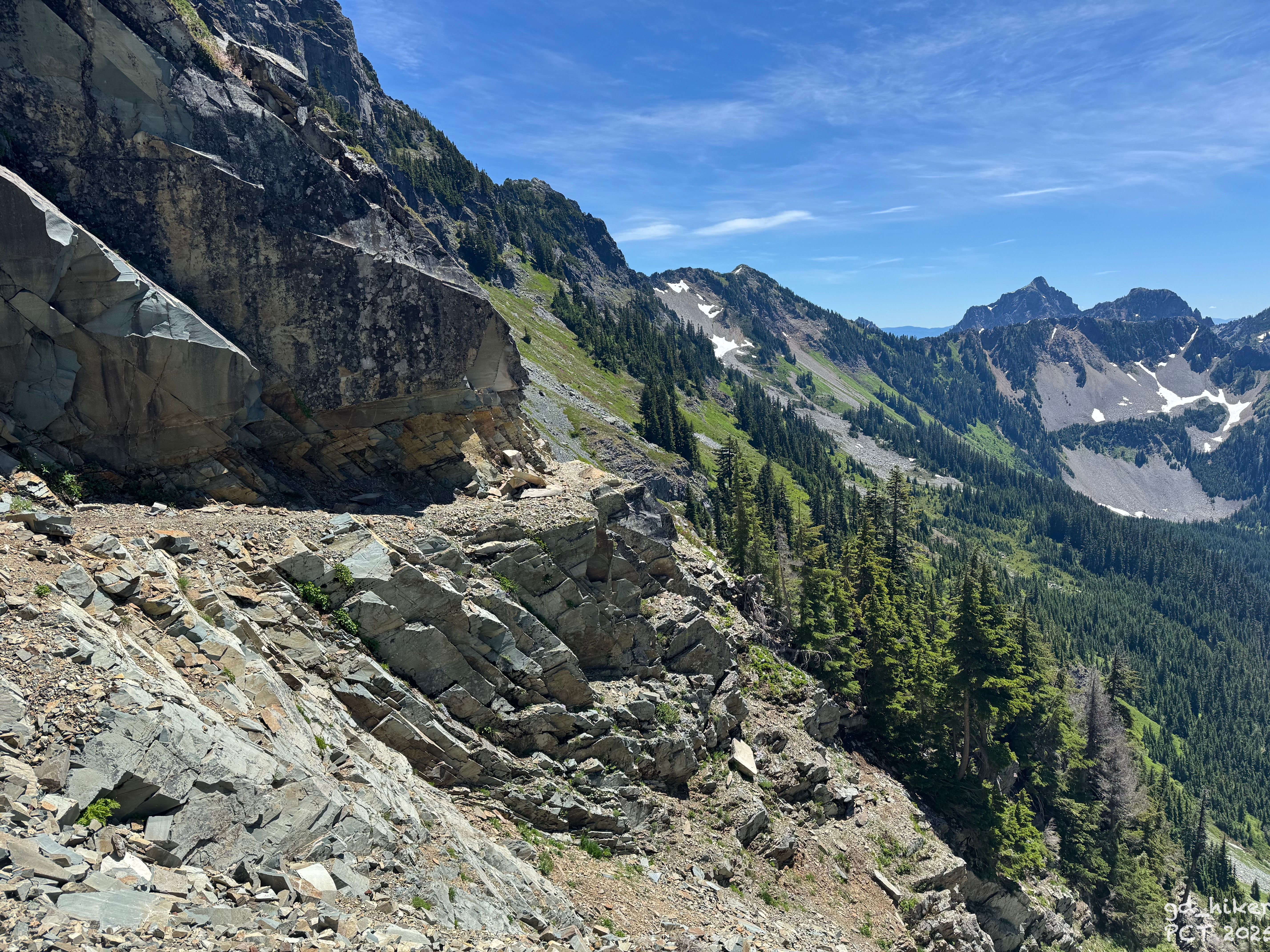 The trail that followed was as well.Continuing along Chikamin Ridge, my gaze constantly shifted between the incredible views and the ground beneath my feet — scree, snow, and narrow paths across steep terrain.