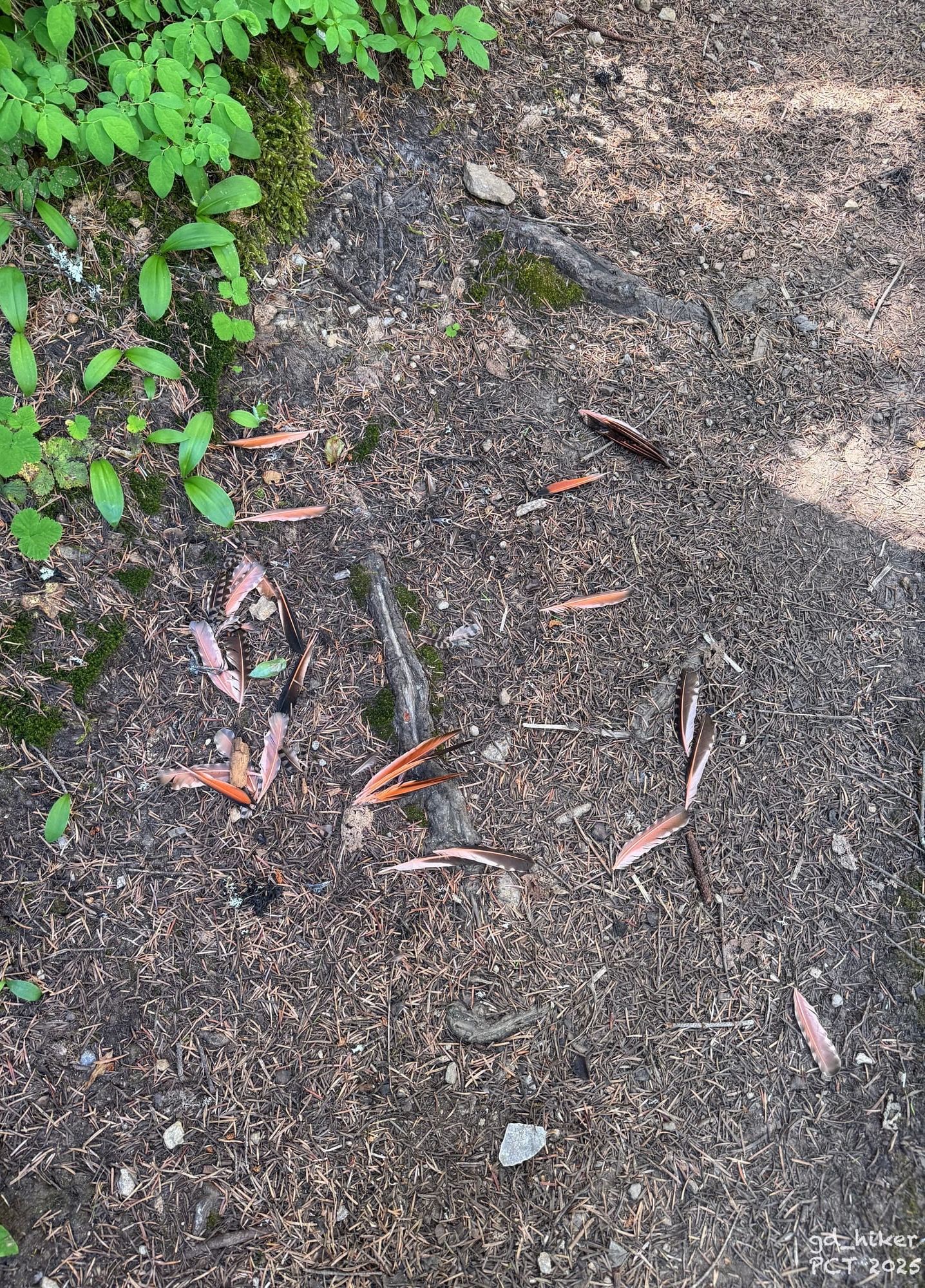 I paused briefly at a pile of feathers on the trail, probably the result of some kind of fight.