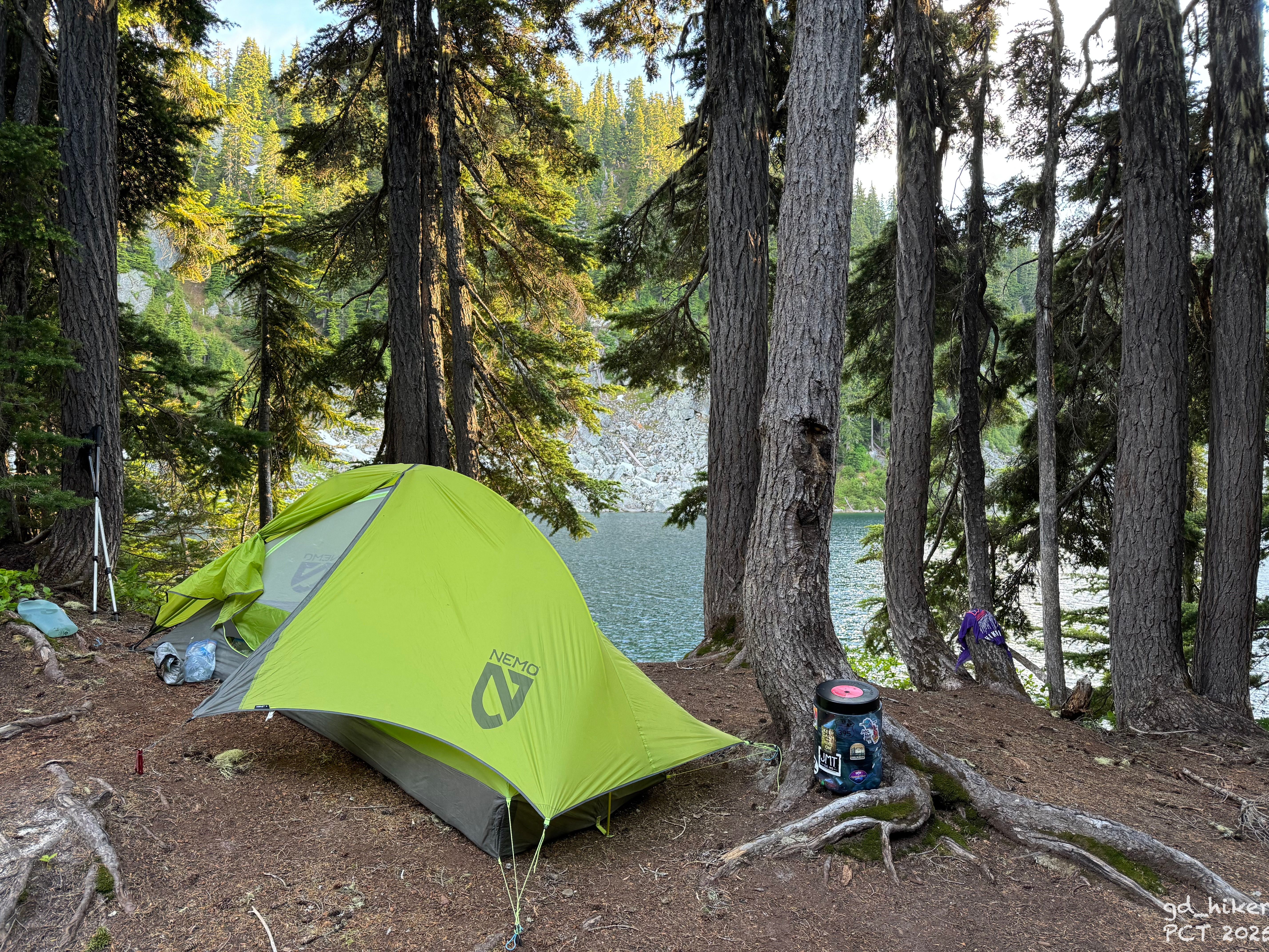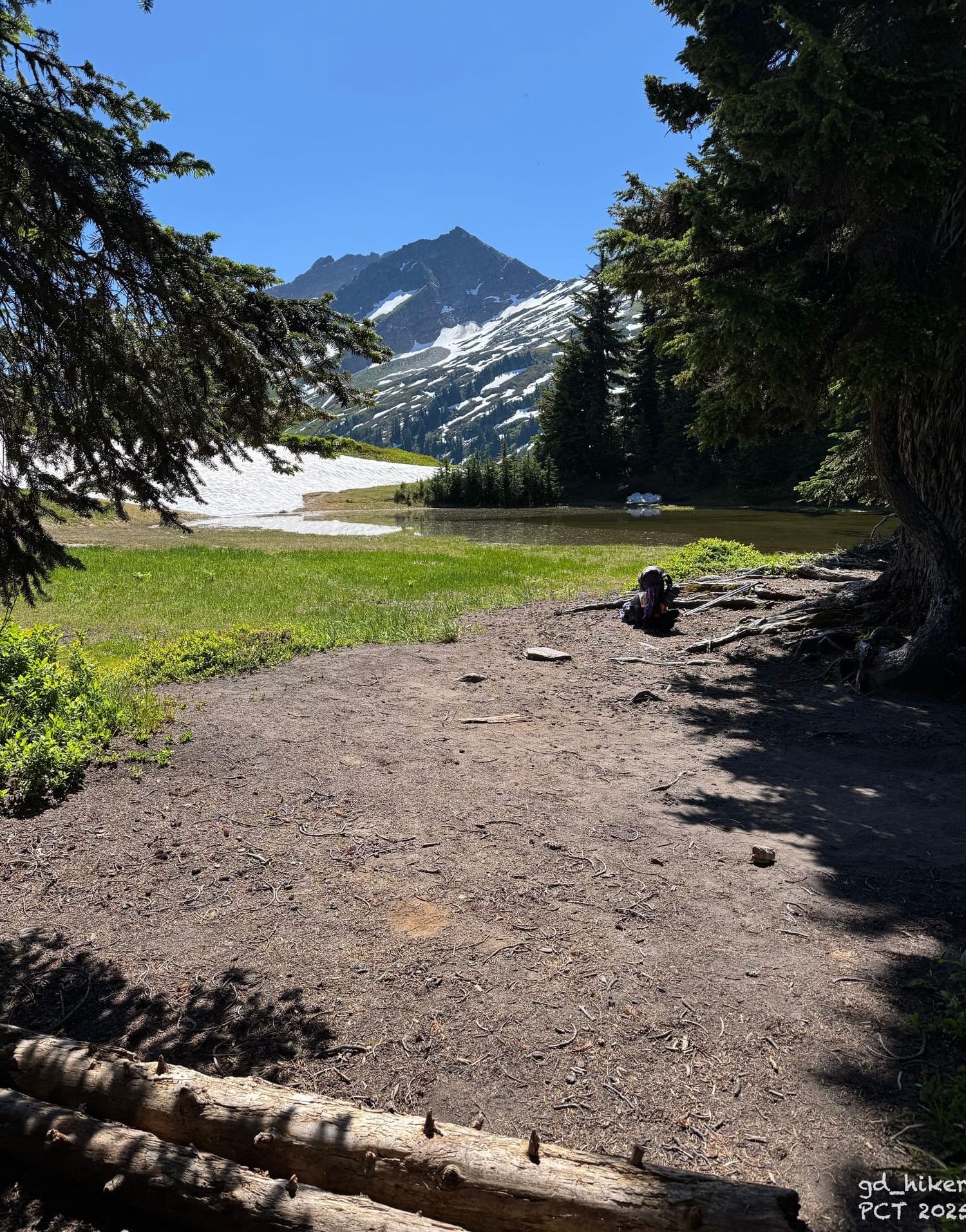 Nach weiteren Switchbacks nach unten und weiteren kurzen Schneefeldern erreichte ich einem Campspot, der bei FarOut als solcher ausgewiesen war.