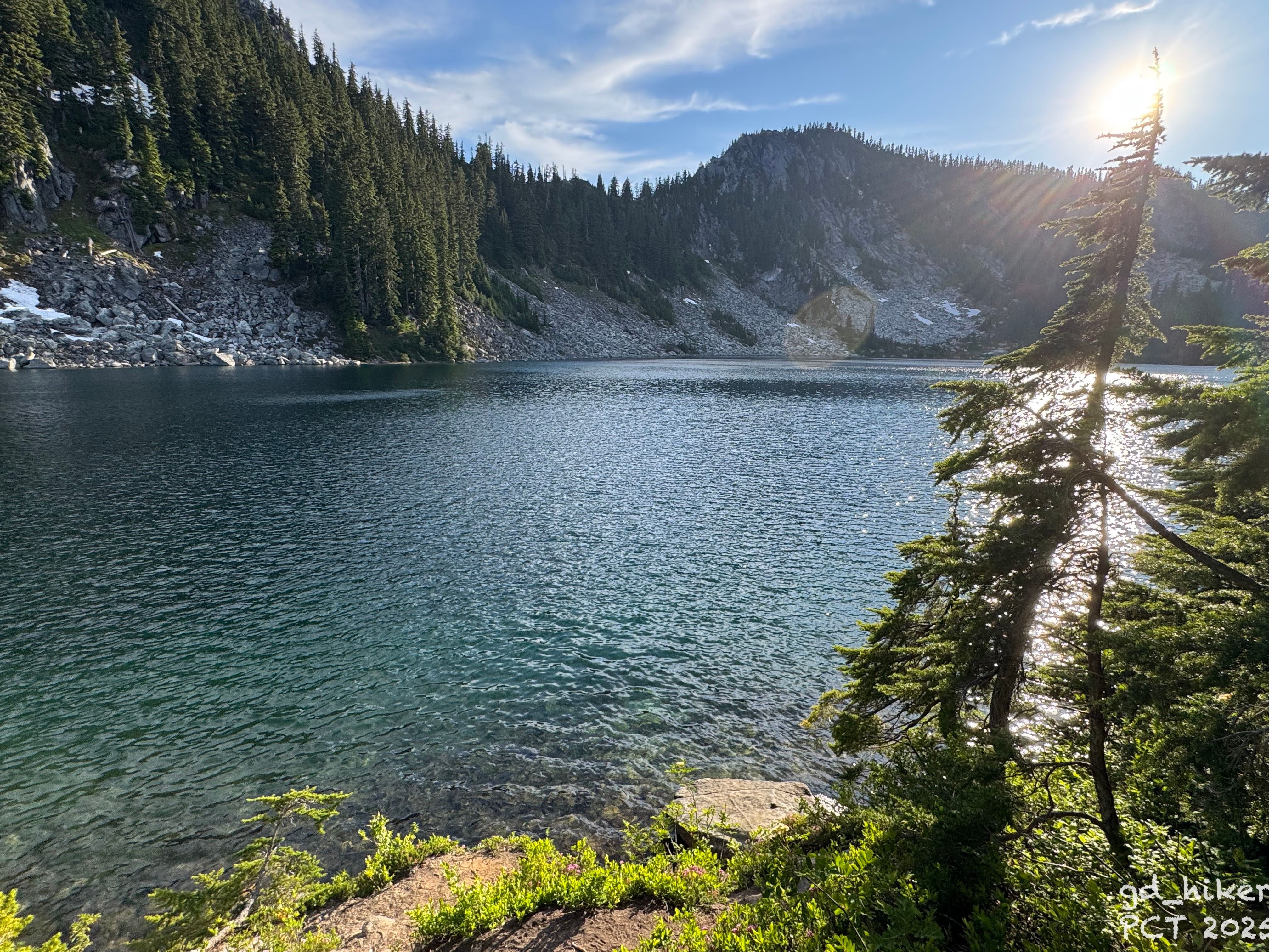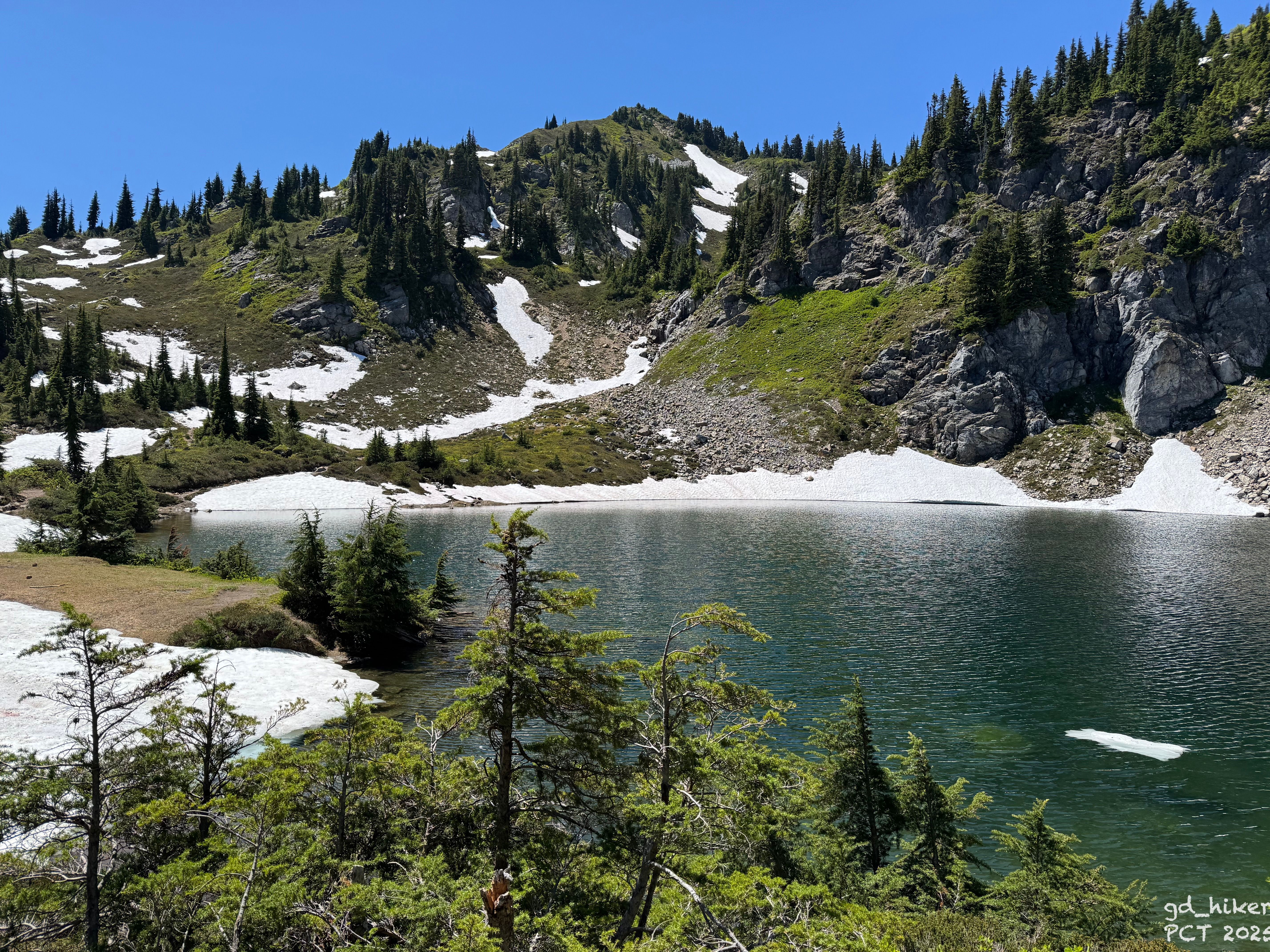 Eventually, the trail continued downward through woodland terrain, and with growing relief, I finally spotted Pear Lake between the trees after several more kilometers.